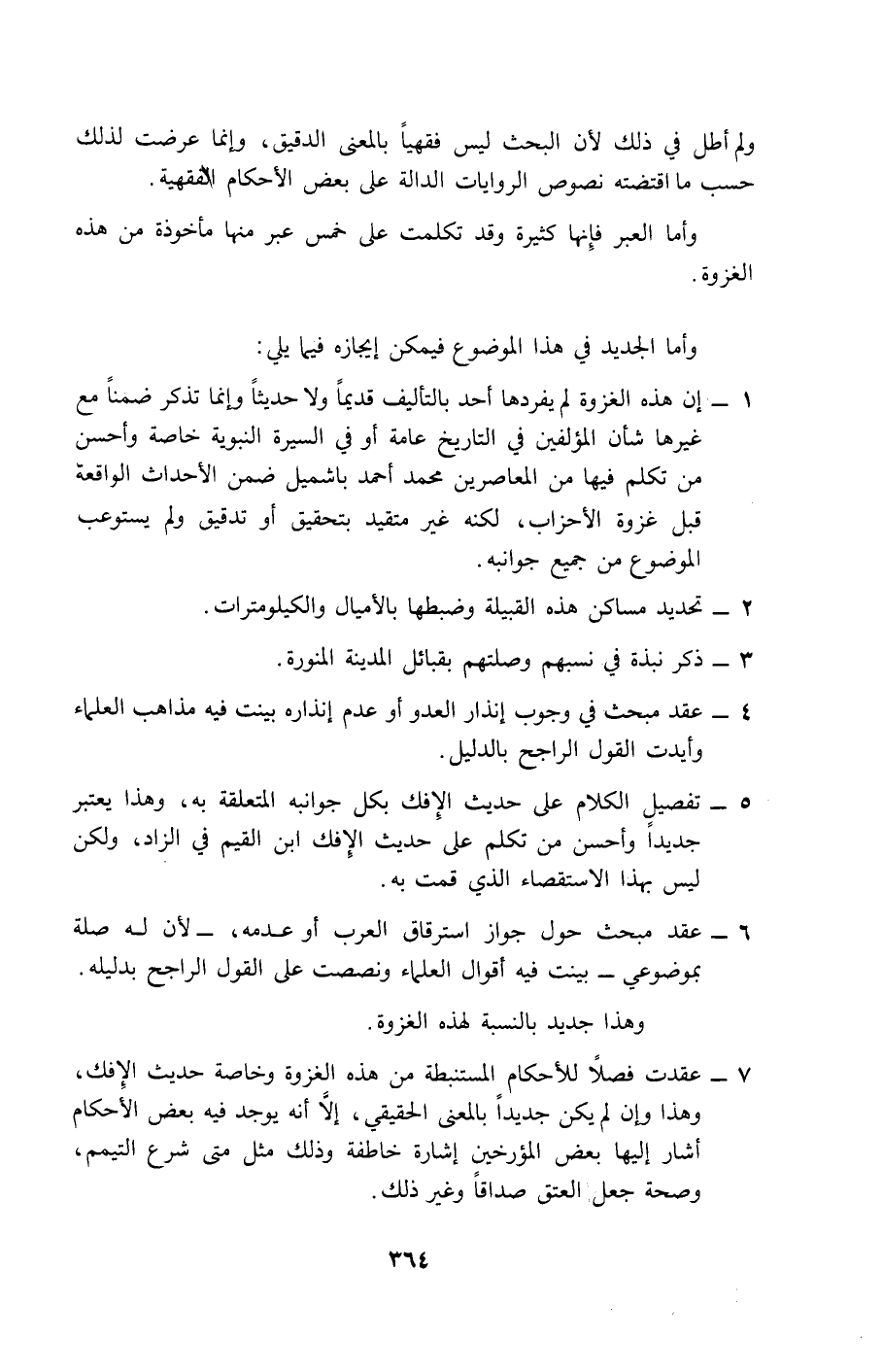 7- عقدت فصلا للأحكام المستنبطة من هذه الغزوة وخاصة حديث الإفك، وهذا وإن لم يكن جديدا بالمعنى الحقيقي، إلا أنه يوجد فيه بعض الأحكام أشار إليها بعض المؤرخين إشارة خاطفة وذلك مثل متى شرع التيمم، وصحة جعل العتق صداقا وغير ذلك.