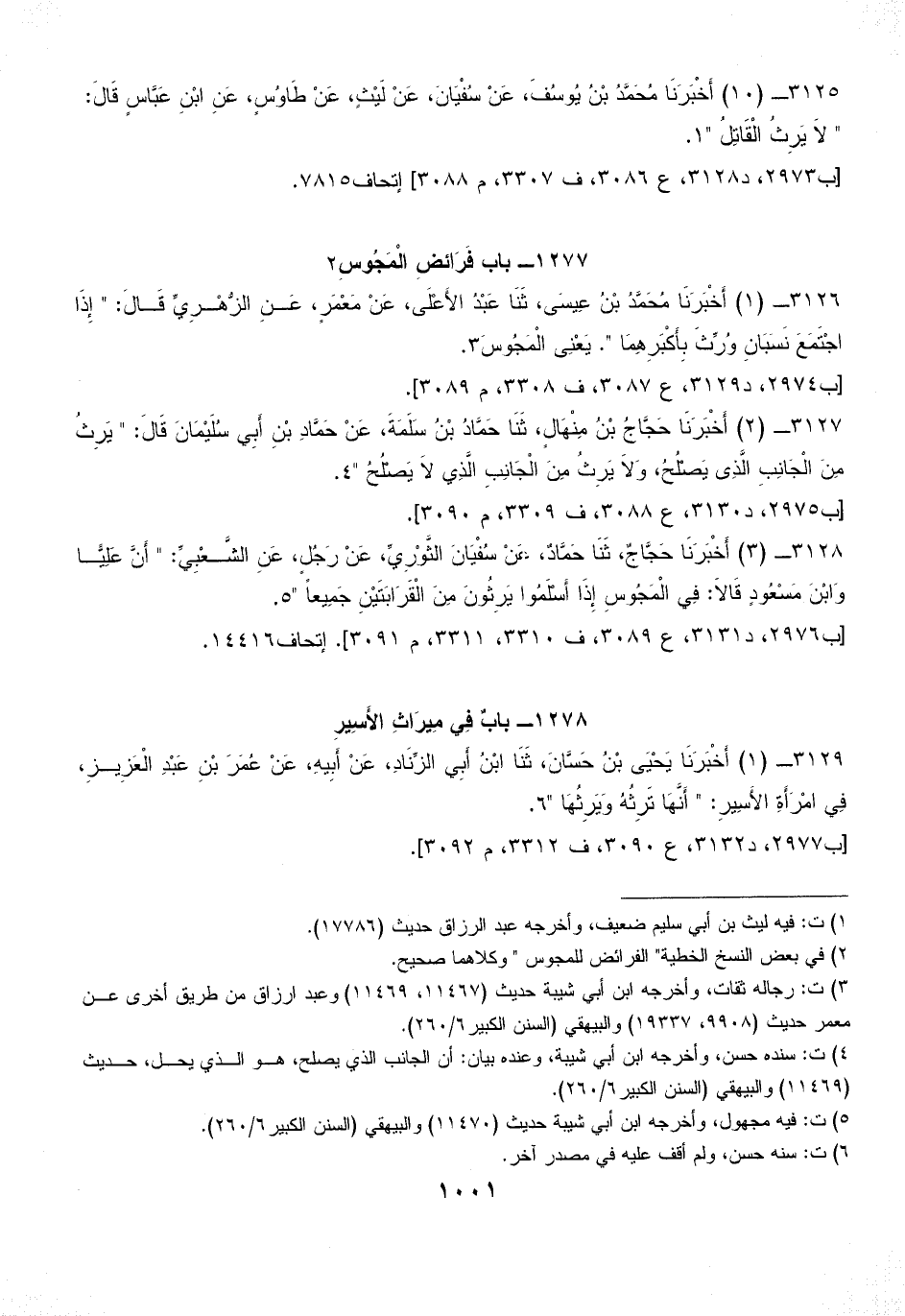 3129 - (1) أَخْبَرَنَا يَحْيَى بْنُ حَسَّانَ، ثَنَا ابْنُ أَبِي الزِّنَادِ، عَنْ أَبِيهِ، عَنْ عُمَرَ بْنِ عَبْدِ الْعَزِيزِ، فِي امْرَأَةِ الأَسِيرِ: " أَنَّهَا تَرِثُهُ وَيَرِثُهَا " (¬6).