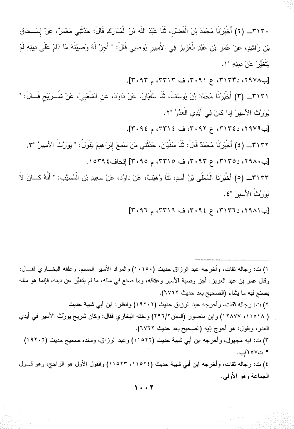 3133 - (5) أَخْبَرَنَا الْمُعَلَّى بْنُ أَسَدٍ، ثَنَا وُهَيْبٌ، عَنْ دَاوُدَ، عَنْ سَعِيدِ بْنِ الْمُسَيَّبِ: " أَنَّهُ كَانَ لاَ يُوَرِّثُ الأَسِيرَ " (¬4).