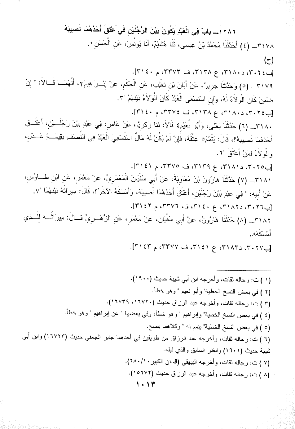 3181 - (7) حَدَّثَنَا هَارُونُ بْنُ مُعَاوِيَةَ، عَنْ أَبِي سُفْيَانَ الْمَعْمَرِيِّ، عَنْ مَعْمَرٍ، عَنِ ابْنِ طَاوُسٍ، عَنْ أَبِيهِ: " فِي عَبْدٍ بَيْنَ رَجُلَيْنِ، أَعْتَقَ أَحَدُهُمَا نَصِيبَهُ، وَأَمْسَكَهُ الآخَرُ؟ ، قَالَ: مِيرَاثُهُ بَيْنَهُمَا " (¬7).
