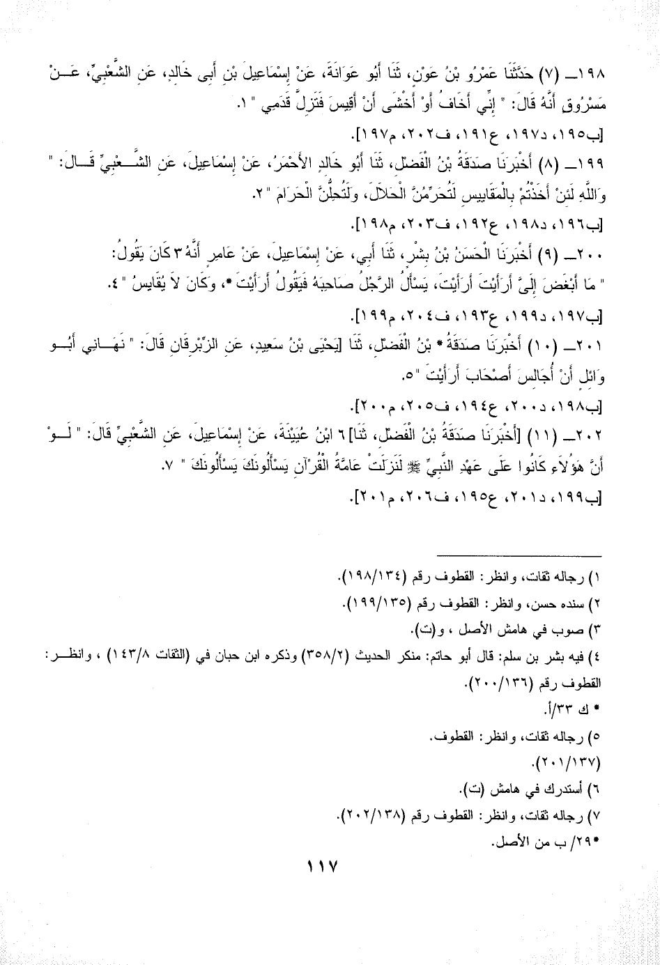 198 - (7) حَدَّثَنَا عَمْرُو بْنُ عَوْنٍ، ثَنَا أَبُو عَوَانَةَ، عَنْ إِسْمَاعِيلَ بْنِ أَبِى خَالِدٍ، عَنِ الشَّعْبِيِّ، عَنْ مَسْرُوقٍ أَنَّهُ قَالَ: " إِنِّي أَخَافُ أَوْ أَخْشَى أَنْ أَقِيسَ فَتَزِلَّ قَدَمِي " (¬1).