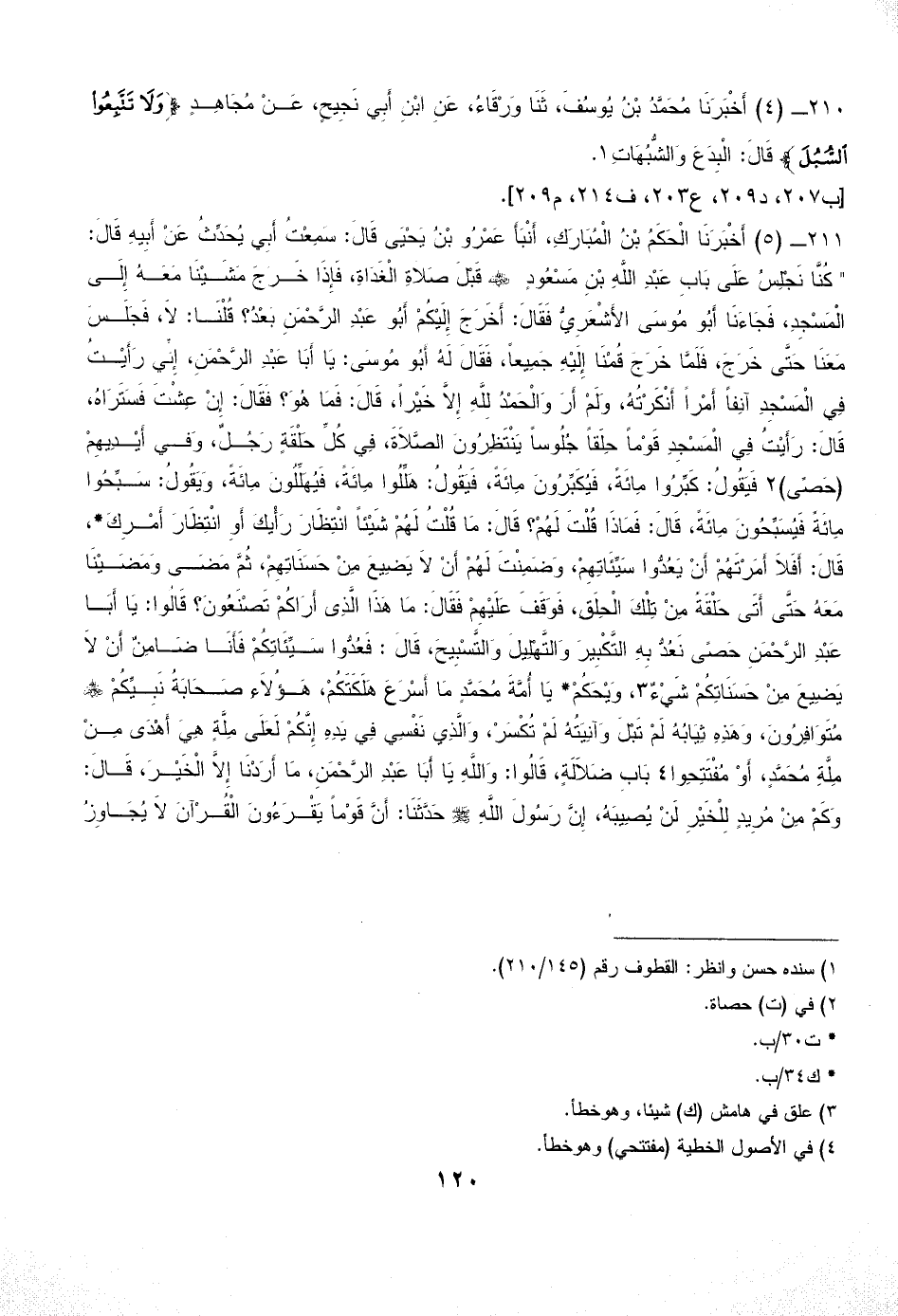 أَمْراً أَنْكَرْتُهُ، وَلَمْ أَرَ وَالْحَمْدُ لِلَّهِ إِلاَّ خَيْراً، قَالَ: فَمَا هُوَ؟ فَقَالَ: إِنْ عِشْتَ فَسَتَرَاهُ، قَالَ: رَأَيْتُ فِي الْمَسْجِدِ قَوْماً حِلَقاً جُلُوساً يَنْتَظِرُونَ الصَّلاَةَ، فِي كُلِّ حَلْقَةٍ رَجُلٌ، وَفي أَيْدِيهِمْ (حَصًى) (¬2) فَيَقُولُ: كَبِّرُوا مِائَةً، فَيُكَبِّرُونَ مِائَةً، فَيَقُولُ: هَلِّلُوا مِائَةً، فَيُهَلِّلُونَ مِائَةً، وَيَقُولُ: سَبِّحُوا مِائَةً فَيُسَبِّحُونَ مِائَةً، قَالَ: فَمَاذَا قُلْتَ لَهُمْ؟ قَالَ: مَا قُلْتُ لَهُمْ شَيْئاً انْتِظَارَ رَأْيِكَ أَوِ انْتِظَارَ أَمْرِكَ*، قَالَ: أَفَلاَ أَمَرْتَهُمْ أَنْ يَعُدُّوا سَيِّئَاتِهِمْ، وَضَمِنْتَ لَهُمْ أَنْ لاَ يَضِيعَ مِنْ حَسَنَاتِهِمْ، ثُمَّ مَضَى وَمَضَيْنَا مَعَهُ حَتَّى أَتَى حَلْقَةً مِنْ تِلْكَ الْحِلَقِ، فَوَقَفَ عَلَيْهِمْ فَقَالَ: مَا هَذَا الَّذِى أَرَاكُمْ تَصْنَعُونَ؟ قَالُوا: يَا أَبَا عَبْدِ الرَّحْمَنِ حَصًى نَعُدُّ بِهِ التَّكْبِيرَ وَالتَّهْلِيلَ وَالتَّسْبِيحَ، قَالَ: فَعُدُّوا سَيِّئَاتِكُمْ فَأَنَا ضَامِنٌ أَنْ لاَ يَضِيعَ مِنْ حَسَنَاتِكُمْ شَيْءٌ (¬3)، وَيْحَكُمْ* يَا أُمَّةَ مُحَمَّدٍ مَا أَسْرَعَ هَلَكَتَكُمْ، هَؤُلاَءِ صَحَابَةُ نَبِيِّكُمْ - رضي الله عنهم - مُتَوَافِرُونَ، وَهَذِهِ ثِيَابُهُ لَمْ تَبْلَ وَآنِيَتُهُ لَمْ تُكْسَرْ، وَالَّذِي نَفْسِي فِي يَدِهِ إِنَّكُمْ لَعَلَى مِلَّةٍ هِيَ أَهْدَى مِنْ مِلَّةِ مُحَمَّدٍ، أَوْ مُفْتَتِحِوا (¬4) بَابِ ضَلاَلَةٍ، قَالُوا: وَاللَّهِ يَا أَبَا عَبْدِ الرَّحْمَنِ، مَا أَرَدْنَا إِلاَّ الْخَيْرَ، قَالَ: وَكَمْ مِنْ مُرِيدٍ لِلْخَيْرِ لَنْ يُصِيبَهُ، إِنَّ رَسُولَ اللَّهِ - صلى الله عليه وسلم - حَدَّثَنَا: أَنَّ قَوْماً يَقْرَءُونَ الْقُرْآنَ لاَ يُجَاوِزُ