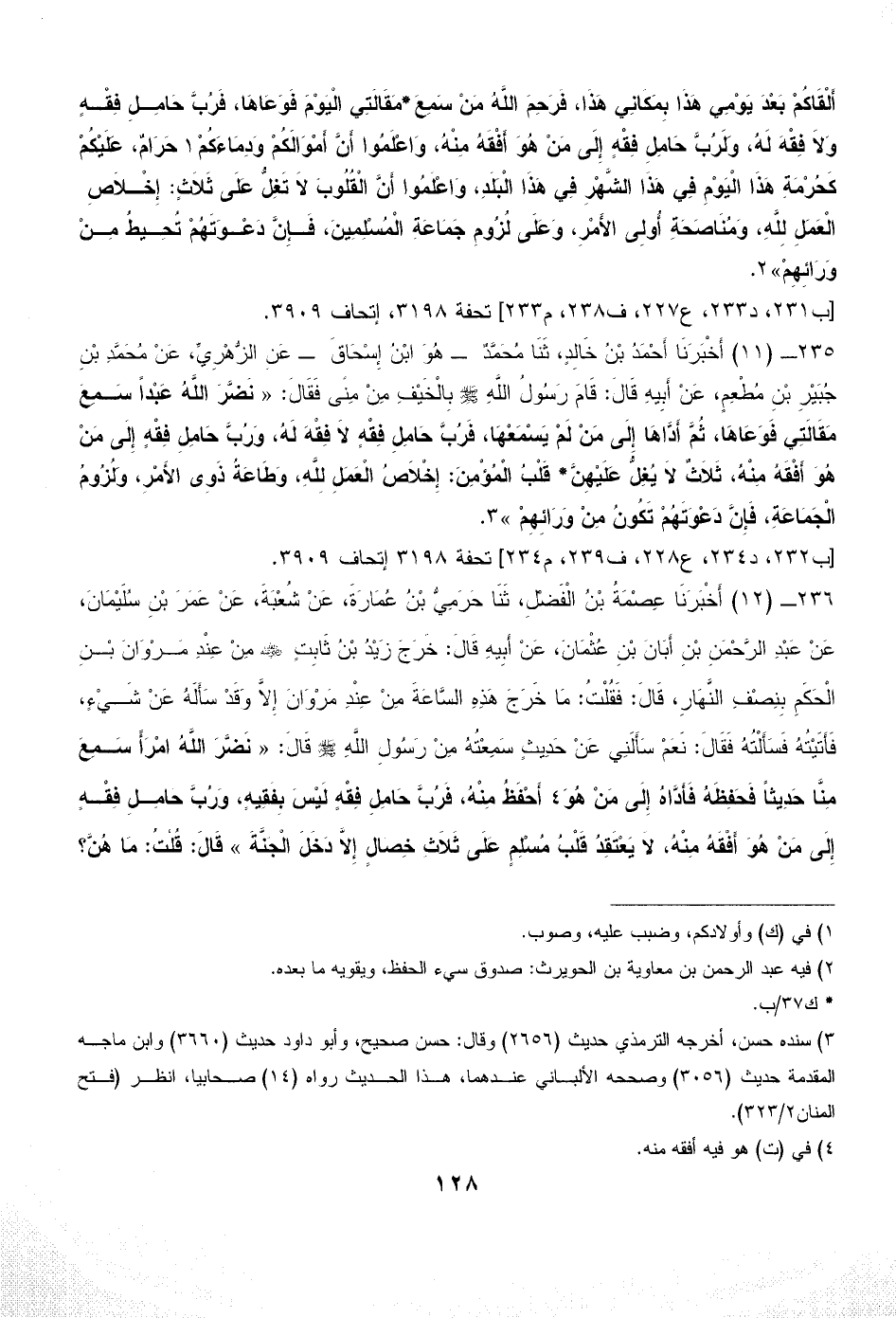 235 - (11) أَخْبَرَنَا أَحْمَدُ بْنُ خَالِدٍ، ثَنَا مُحَمَّدٌ - هُوَ ابْنُ إِسْحَاقَ - عَنِ الزُّهْرِيِّ، عَنْ مُحَمَّدِ بْنِ جُبَيْرِ بْنِ مُطْعِمٍ، عَنْ أَبِيهِ قَالَ: قَامَ رَسُولُ اللَّهِ - صلى الله عليه وسلم - بِالْخَيْفِ مِنْ مِنًى فَقَالَ: «نَضَّرَ اللَّهُ عَبْداً سَمِعَ مَقَالَتِي فَوَعَاهَا، ثُمَّ أَدَّاهَا إِلَى مَنْ لَمْ يَسْمَعْهَا، فَرُبَّ حَامِلِ فِقْهٍ لاَ فِقْهَ لَهُ، وَرُبَّ حَامِلِ فِقْهٍ إِلَى مَنْ هُوَ أَفْقَهُ مِنْهُ، ثَلاَثٌ لاَ يُغِلُّ عَلَيْهِنَّ* قَلْبُ الْمُؤْمِنَ: إِخْلاَصُ الْعَمَلِ لِلَّهِ، وَطَاعَةُ ذَوِى الأَمْرِ، وَلُزُومُ الْجَمَاعَةِ، فَإِنَّ دَعْوَتَهُمْ تَكُونُ مِنْ وَرَائِهِمْ» (¬3).