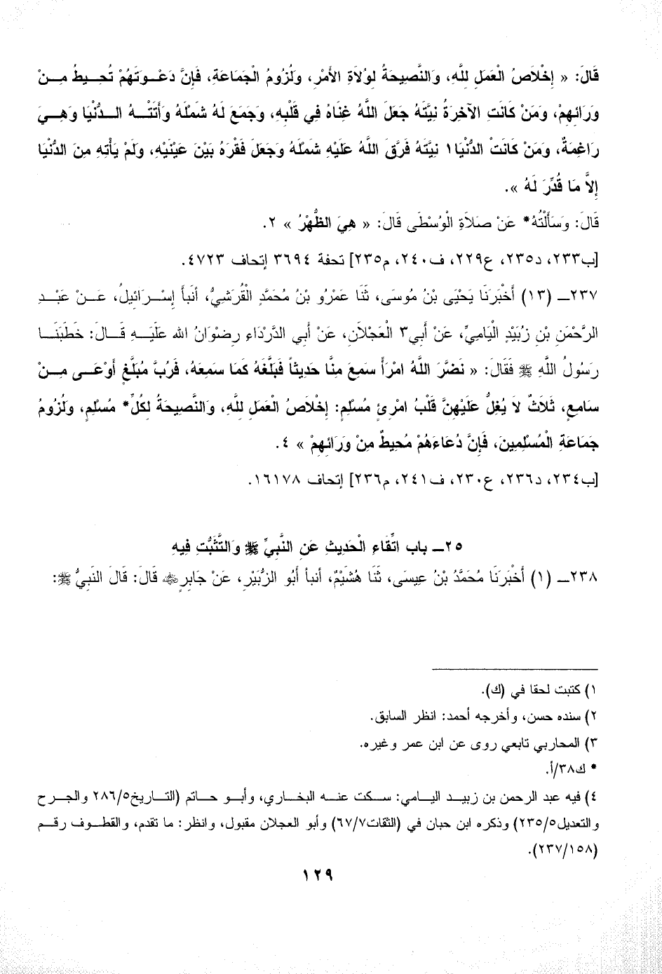 (¬4) فيه عبد الرحمن بن زبيد اليامي: سكت عنه البخاري، وأبو حاتم (التاريخ 5/ 286 والجرح والتعديل 5/ 235) وذكره ابن حبان في (الثقات 7/ 67) وأبو العجلان مقبول، وانظر: ما تقدم، والقطوف رقم (158/ 237).