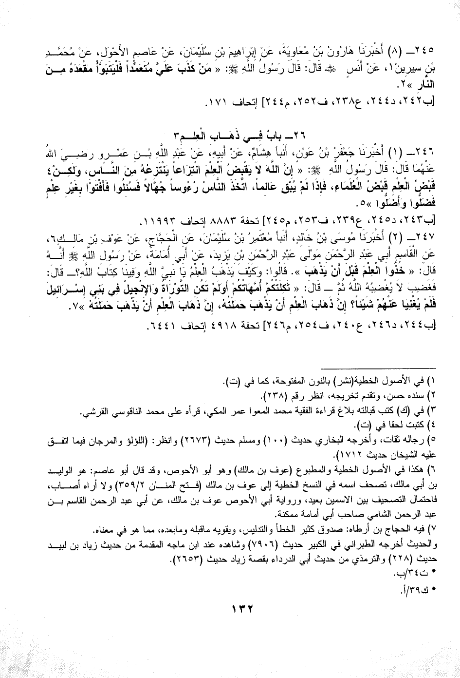 246 - (1) أَخْبَرَنَا جَعْفَرُ بْنُ عَوْنٍ، أَنَبأ هِشَامٌ، عَنْ أَبِيهِ، عَنْ عَبْدِ اللَّهِ بْنِ عَمْرٍو رَضِيَ اللهُ عَنْهُمَا قَالَ: قَالَ رَسُولُ اللَّهِ - صلى الله عليه وسلم -: «إِنَّ اللَّهَ لاَ يَقْبِضُ الْعِلْمَ انْتِزَاعاً يَنْتَزِعُهُ مِنَ النَّاسِ، وَلَكِنْ (¬4) قَبْضُ الْعِلْمِ قَبْضُ الْعُلَمَاءِ، فَإِذَا لَمْ يُبْقِ عَالِماً، اتَّخَذَ النَّاسُ رُءُوساً جُهَّالاً فَسُئِلُوا فَأَفْتَوْا بِغَيْرِ عِلْمٍ فَضَلُّوا وَأَضَلُّوا» (¬5).