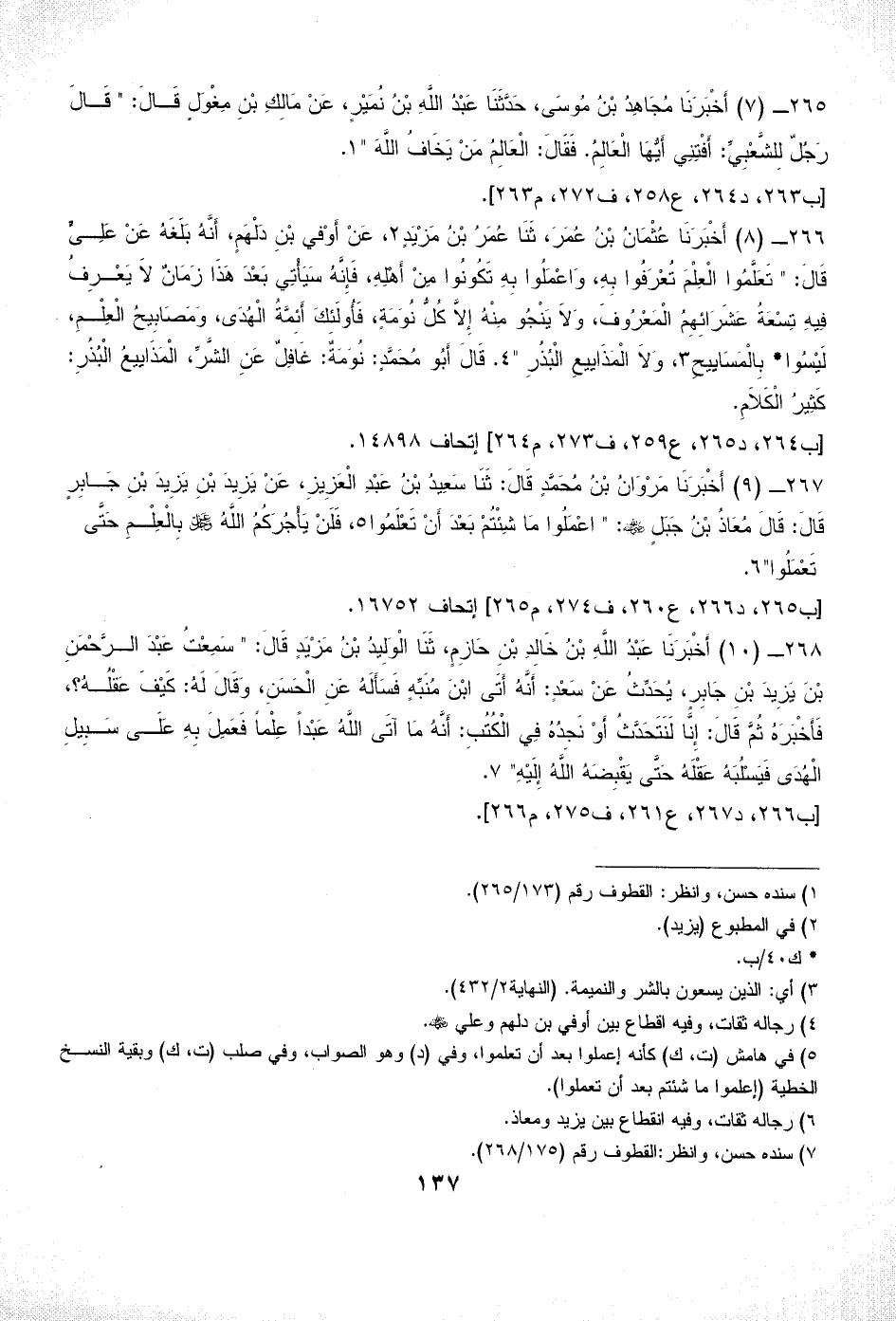 265 - (7) أَخْبَرَنَا مُجَاهِدُ بْنُ مُوسَى، حَدَّثَنَا عَبْدُ اللَّهِ بْنُ نُمَيْرٍ، عَنْ مَالِكِ بْنِ مِغْوَلٍ قَالَ: " قَالَ رَجُلٌ لِلشَّعْبِيِّ: أَفْتِنِي أَيُّهَا الْعَالِمُ. فَقَالَ: الْعَالِمُ مَنْ يَخَافُ اللَّهَ " (¬1).