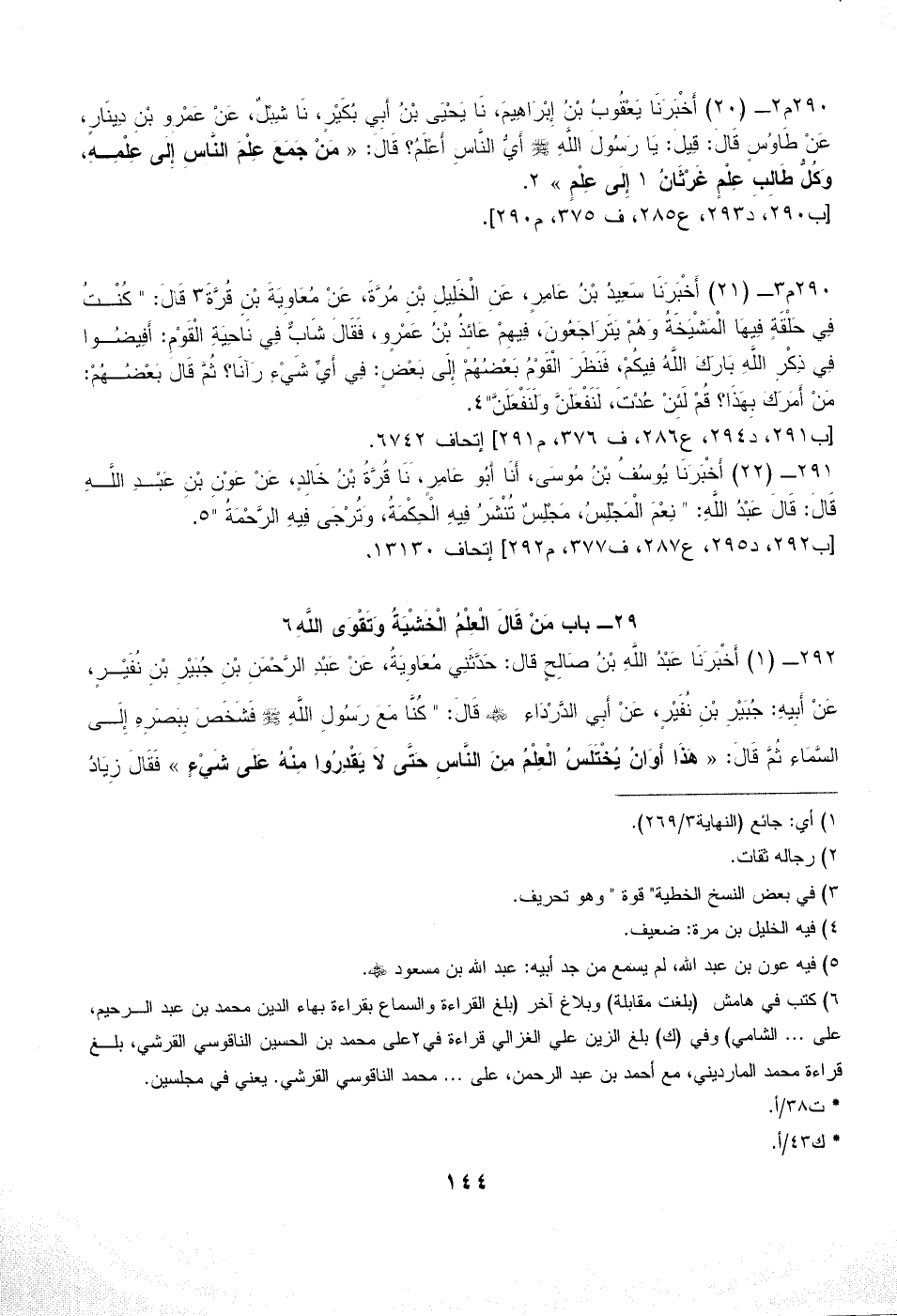 292 - (1) أَخْبَرَنَا عَبْدُ اللَّهِ بْنُ صَالِحٍ قال: حَدَّثَنِي مُعَاوِيَةُ، عَنْ عَبْدِ الرَّحْمَنِ بْنِ جُبَيْرِ بْنِ نُفَيْرٍ، عَنْ أَبِيهِ: جُبَيْرِ بْنِ نُفَيْرٍ، عَنْ أَبِي الدَّرْدَاءِ - رضي الله عنه - قَالَ: " كُنَّا مَعَ رَسُولِ اللَّهِ - صلى الله عليه وسلم - فَشَخَصَ بِبَصَرِهِ إِلَى السَّمَاءِ ثُمَّ قَالَ: «هَذَا أَوَانُ يُخْتَلَسُ الْعِلْمُ مِنَ النَّاسِ حَتَّى لاَ يَقْدِرُوا مِنْهُ عَلَى شَيْءٍ» فَقَالَ زِيَادُ