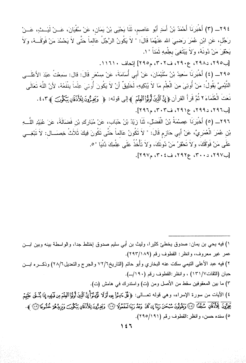 295 - (4) أَخْبَرَنَا سَعِيدُ بْنُ سُلَيْمَانَ، عَنْ أَبِي أُسَامَةَ، عَنْ مِسْعَرٍ قَالَ: قال: سَمِعْتُ عَبْدَ الأَعْلَى التَّيْمِيَّ يَقُولُ: مَنْ أُوتِىَ مِنَ الْعِلْمِ مَا لاَ يُبْكِيهِ، لَخَلِيقٌ أَنْ لاَ يَكُونَ أُوتِيَ عِلْماً يَنْفَعُهُ، لأَنَّ اللَّهَ تَعَالَى