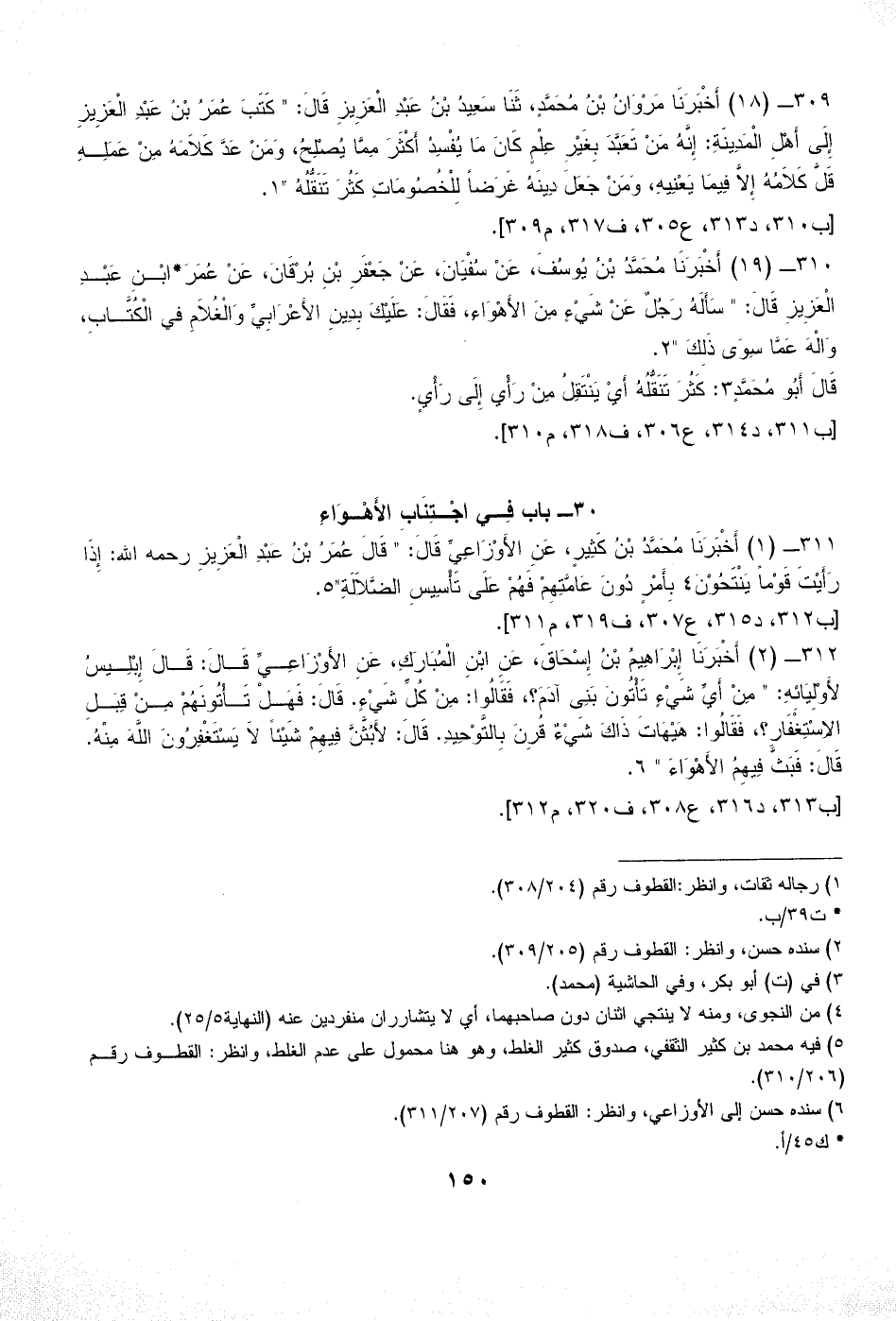 311 - (1) أَخْبَرَنَا مُحَمَّدُ بْنُ كَثِيرٍ، عَنِ الأَوْزَاعِيِّ قَالَ: " قَالَ عُمَرُ بْنُ عَبْدِ الْعَزِيزِ رحمه الله: إِذَا رَأَيْتَ قَوْماً يَنْتَحُوْنَ (¬4) بِأَمْرٍ دُونَ عَامَّتِهِمْ فَهُمْ عَلَى تَأْسِيسِ الضَّلاَلَةِ" (¬5).