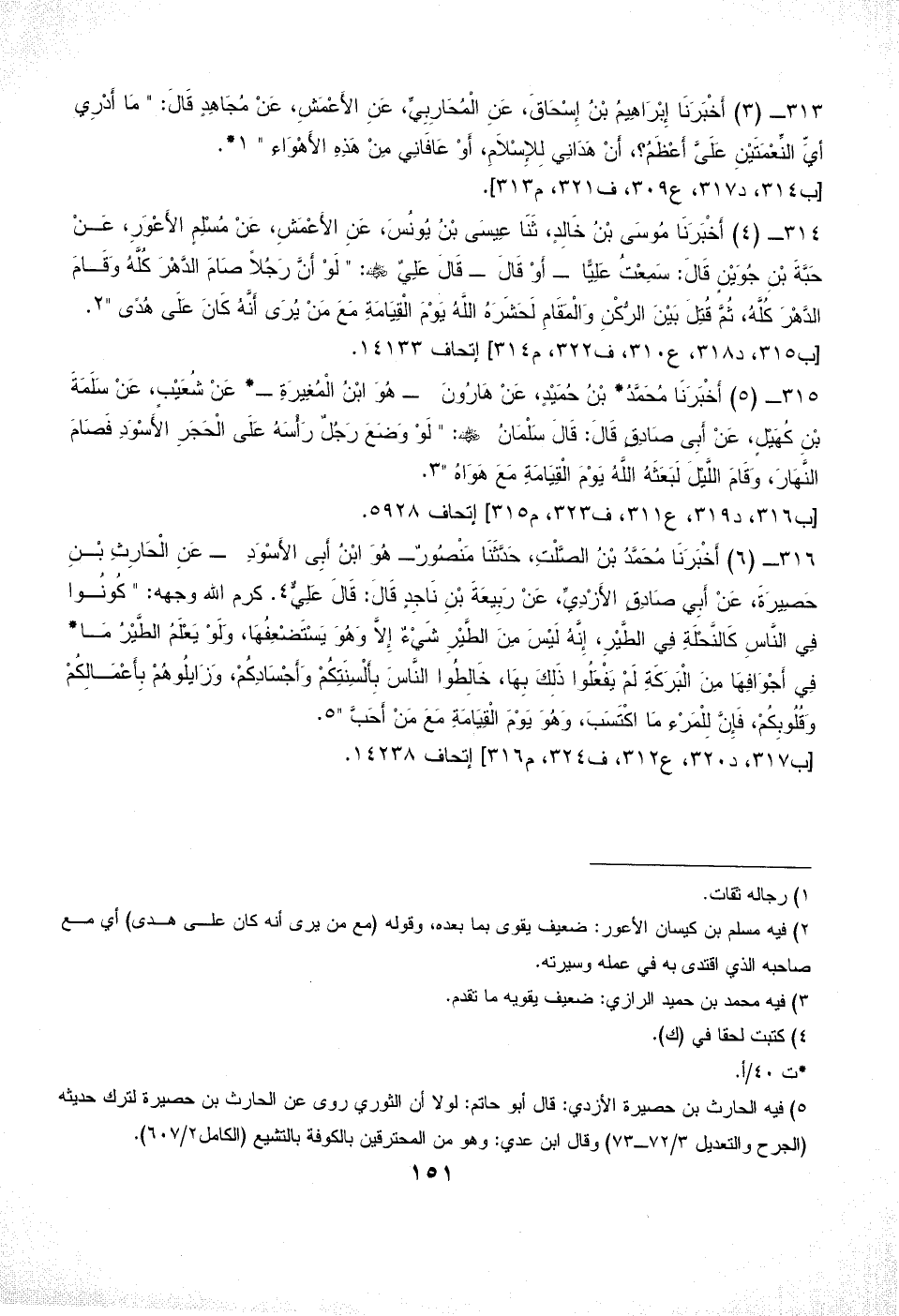 (¬5) فيه الحارث بن حصيرة الأزدي: قال أبو حاتم: لولا أن الثوري روى عن الحارث بن حصيرة لترك حديثه (الجرح والتعديل 3/ 72 - 73) وقال ابن عدي: وهو من المحترقين بالكوفة بالتشيع (الكامل 2/ 607).
