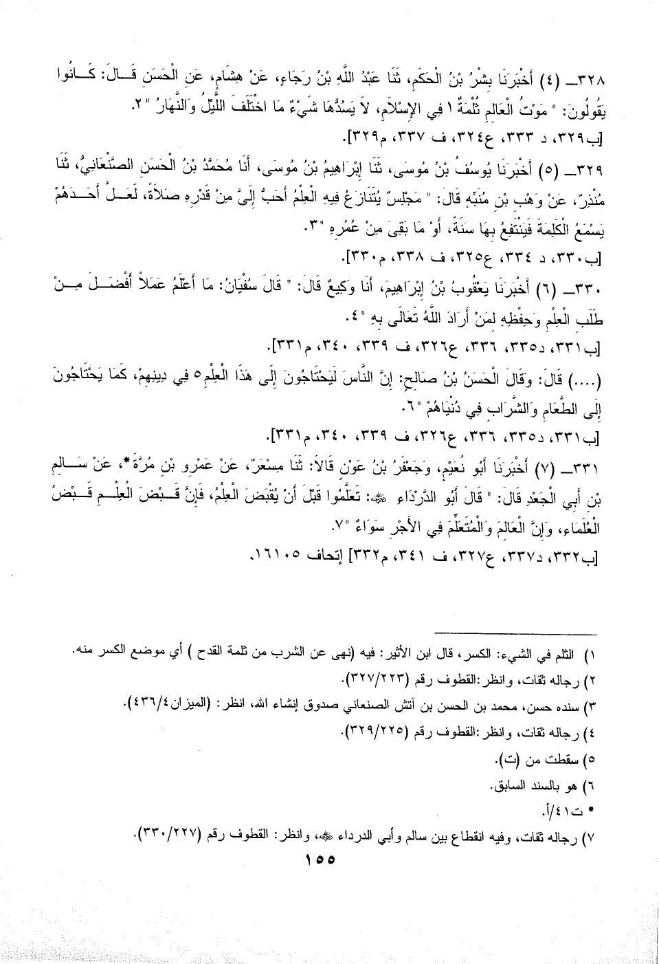330 - (6) أَخْبَرَنَا يَعْقُوبُ بْنُ إِبْرَاهِيمَ، أَنَا وَكِيعٌ قَالَ: " قَالَ سُفْيَانُ: مَا أَعْلَمُ عَمَلاً أَفْضَلَ مِنْ طَلَبِ الْعِلْمِ وَحِفْظِهِ لِمَنْ أَرَادَ اللَّهُ تَعَالَى بِهِ " (¬4).