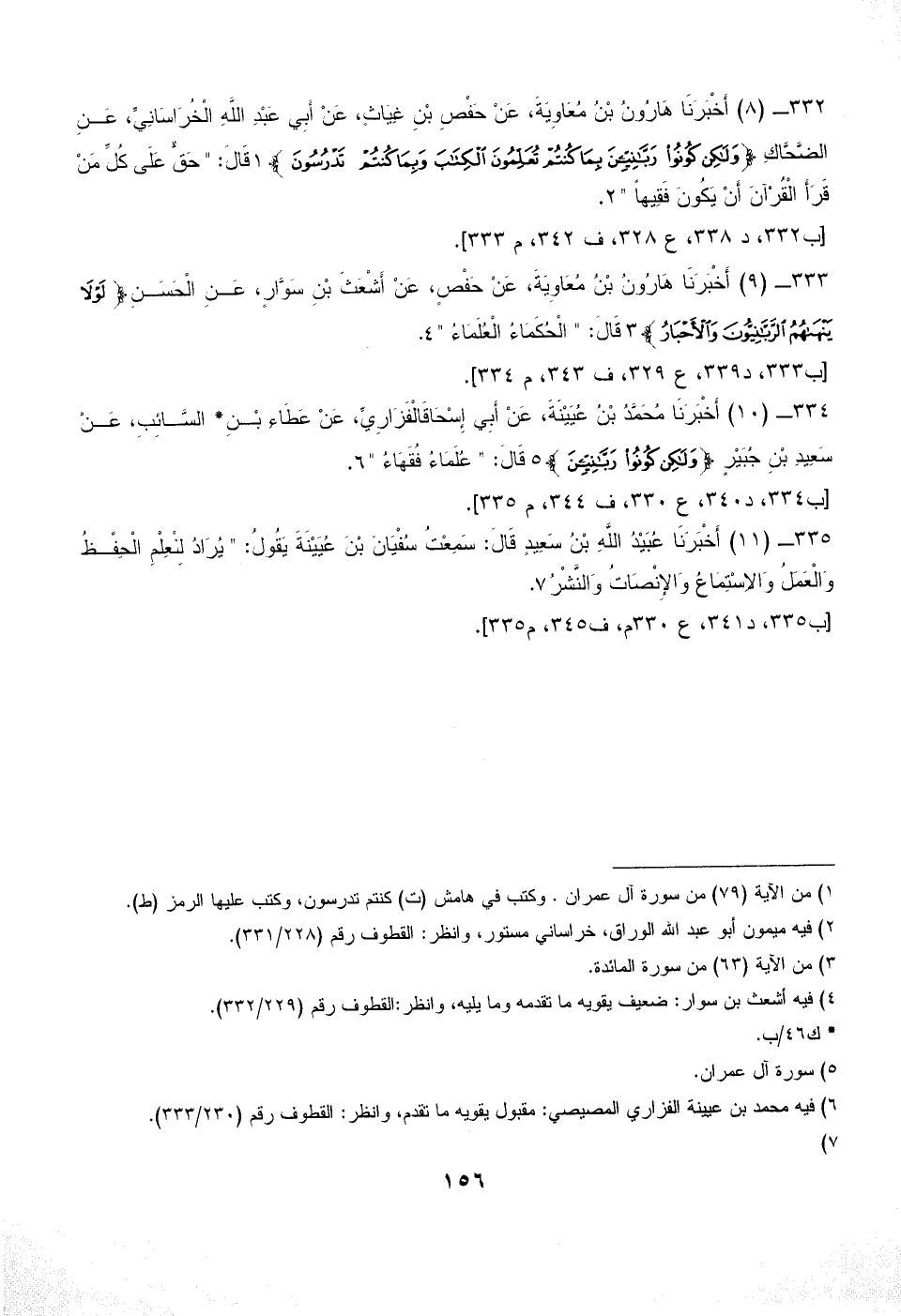 334 - (10) أَخْبَرَنَا مُحَمَّدُ بْنُ عُيَيْنَةَ، عَنْ أَبِي إِسْحَاقَ الْفَزَارِيِّ، عَنْ عَطَاءِ بْنِ* السَّائِبِ، عَنْ سَعِيدِ بْنِ جُبَيْرٍ {وَلَكِنْ كُونُوا رَبَّانِيِّينَ} (¬5) قَالَ: " عُلَمَاءُ فُقَهَاءُ " (¬6).