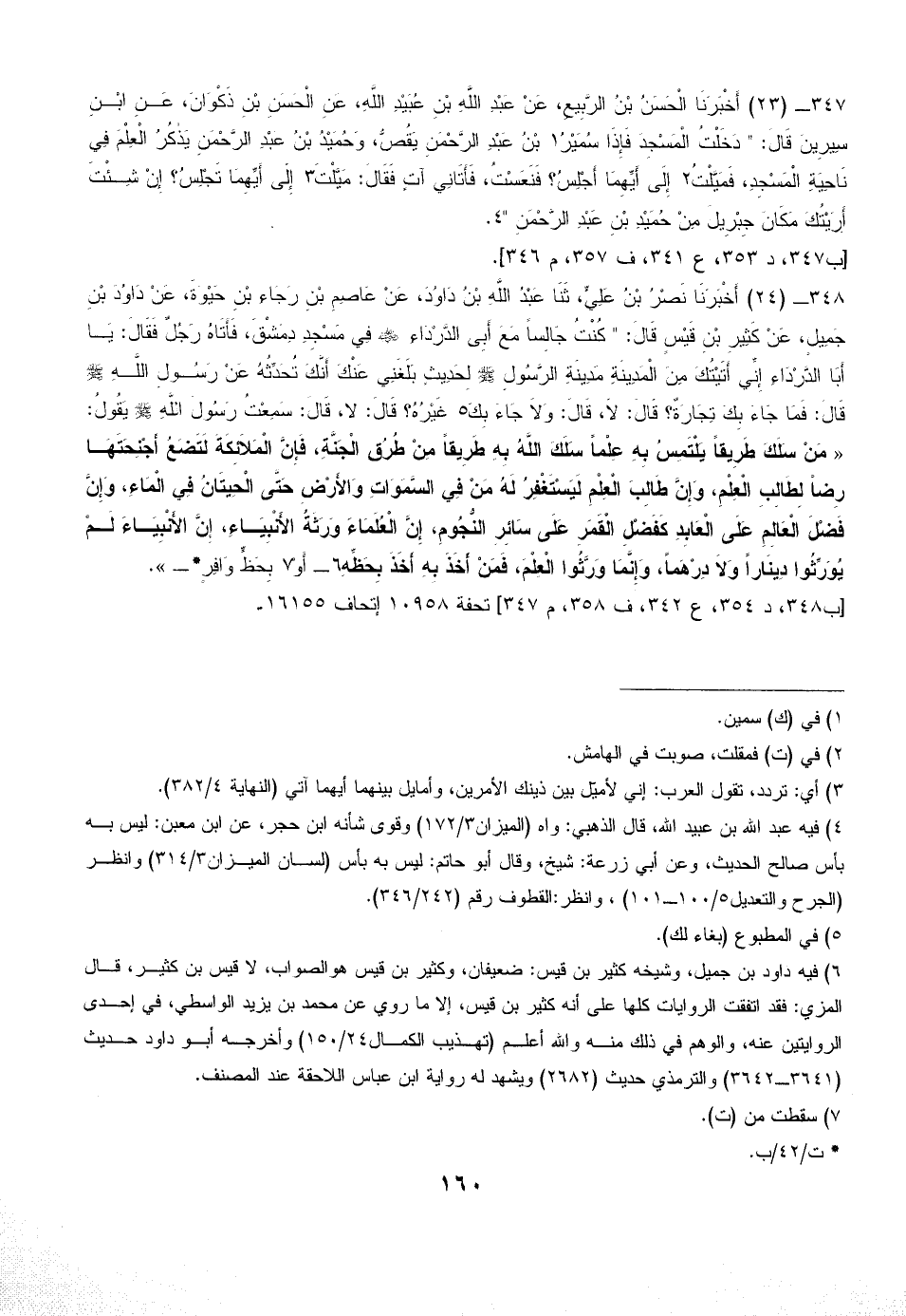 348 - (24) أَخْبَرَنَا نَصْرُ بْنُ عَلِيٍّ، ثَنَا عَبْدُ اللَّهِ بْنُ دَاوُدَ، عَنْ عَاصِمِ بْنِ رَجَاءِ بْنِ حَيْوَةَ، عَنْ دَاوُدَ بْنِ جَمِيلٍ، عَنْ كَثِيرِ بْنِ قَيْسٍ قَالَ: " كُنْتُ جَالِساً مَعَ أَبِى الدَّرْدَاءِ - رضي الله عنه - فِي مَسْجِدِ دِمَشْقَ، فَأَتَاهُ رَجُلٌ فَقَالَ: يَا أَبَا الدَّرْدَاءِ إِنِّي أَتَيْتُكَ مِنَ الْمَدِينَةِ مَدِينَةِ الرَّسُولِ - صلى الله عليه وسلم - لِحَدِيثٍ بَلَغَنِي عَنْكَ أَنَّكَ تُحَدِّثُهُ عَنْ رَسُولِ اللَّهِ - صلى الله عليه وسلم - قَالَ: فَمَا جَاءَ بِكَ تِجَارَةٌ؟ قَالَ: لاَ، قَالَ: وَلاَ جَاءَ بِكَ (¬5) غَيْرُهُ؟ قَالَ: لا، قَالَ: سَمِعْتُ رَسُولَ اللَّهِ - صلى الله عليه وسلم - يَقُولُ: «مَنْ سَلَكَ طَرِيقاً يَلْتَمِسُ بِهِ عِلْماً سَلَكَ اللَّهُ بِهِ طَرِيقاً مِنْ طُرُقِ الْجَنَّةِ، فَإِنَّ الْمَلاَئِكَةَ لَتَضَعُ أَجْنِحَتَهَا رِضاً لِطَالِبِ الْعِلْمِ، وَإِنَّ طَالِبَ الْعِلْمِ لَيَسْتَغْفِرُ لَهُ مَنْ فِي السَّمَوَاتِ وَالأَرْضِ حَتَّى الْحِيتَانُ فِي الْمَاءِ، وَإِنَّ فَضْلَ الْعَالِمِ عَلَى الْعَابِدِ كَفَضْلِ الْقَمَرِ عَلَى سَائِرِ النُّجُومِ، إِنَّ الْعُلَمَاءَ وَرَثَةُ الأَنْبِيَاءِ، إِنَّ الأَنْبِيَاءَ لَمْ يُوَرِّثُوا دِينَاراً وَلاَ دِرْهَماً، وَإِنَّمَا وَرَّثُوا الْعِلْمَ، فَمَنْ أَخَذَ بِهِ أَخَذَ بِحَظِّهِ (¬6) - أَوْ (¬7) بِحَظٍّ وَافِرٍ*ـ».