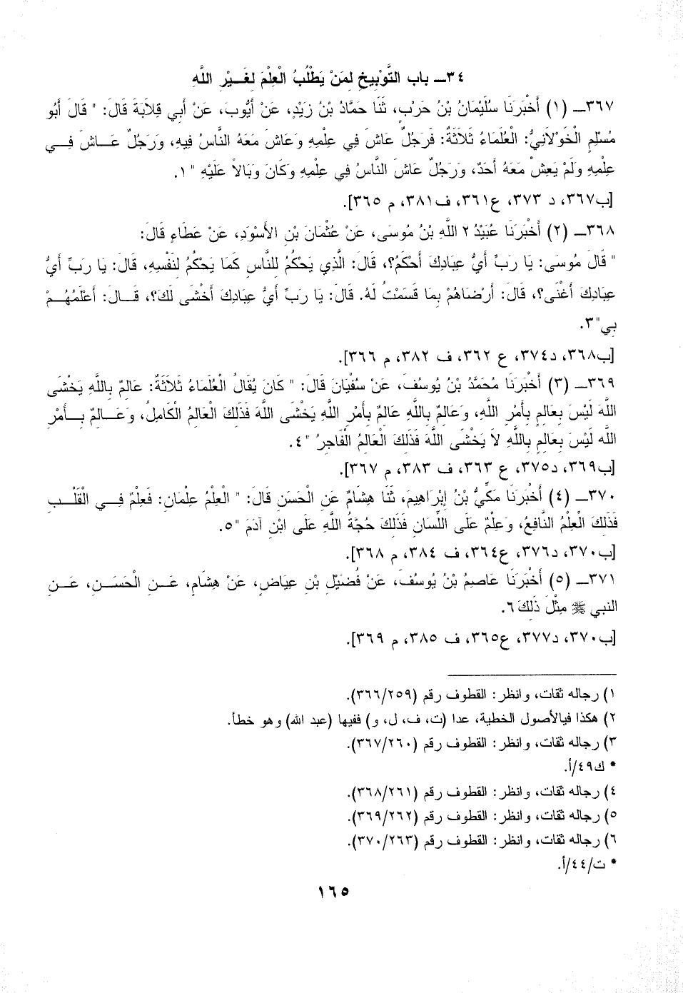 367 - (1) أَخْبَرَنَا سُلَيْمَانُ بْنُ حَرْبٍ، ثَنَا حَمَّادُ بْنُ زَيْدٍ، عَنْ أَيُّوبَ، عَنْ أَبِي قِلاَبَةَ قَالَ: " قَالَ أَبُو مُسْلِمٍ الْخَوْلاَنِيُّ: الْعُلَمَاءُ ثَلاَثَةٌ: فَرَجُلٌ عَاشَ فِي عِلْمِهِ وَعَاشَ مَعَهُ النَّاسُ فِيهِ، وَرَجُلٌ عَاشَ فِي عِلْمِهِ وَلَمْ يَعِشْ مَعَهُ أَحَدٌ، وَرَجُلٌ عَاشَ النَّاسُ فِي عِلْمِهِ وَكَانَ وَبَالاً عَلَيْهِ " (¬1).