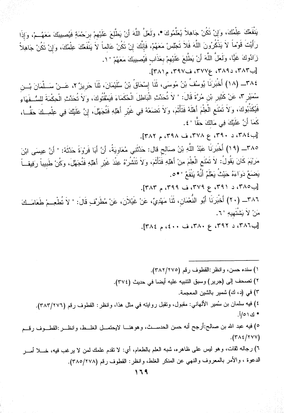 385 - (19) أَخْبَرَنَا عَبْدُ اللَّهِ بْنُ صَالِحٍ قال: حَدَّثَنِي مُعَاوِيَةُ، أَنَّ أَبَا فَرْوَةَ حَدَّثَهُ: " أَنَّ عِيسَى ابْنَ مَرْيَمَ كَانَ يَقُولُ: لاَ تَمْنَعِ الْعِلْمَ مِنْ أَهْلِهِ فَتَأْثَمَ، وَلاَ تَنْشُرْهُ عِنْدَ غَيْرِ أَهْلِهِ فَتُجَهَّلَ، وَكُنْ طَبِيباً رَفِيقاً يَضَعُ دَوَاءَهُ حَيْثُ يَعْلَمُ أَنَّهُ يَنْفَعُ "* (¬5).