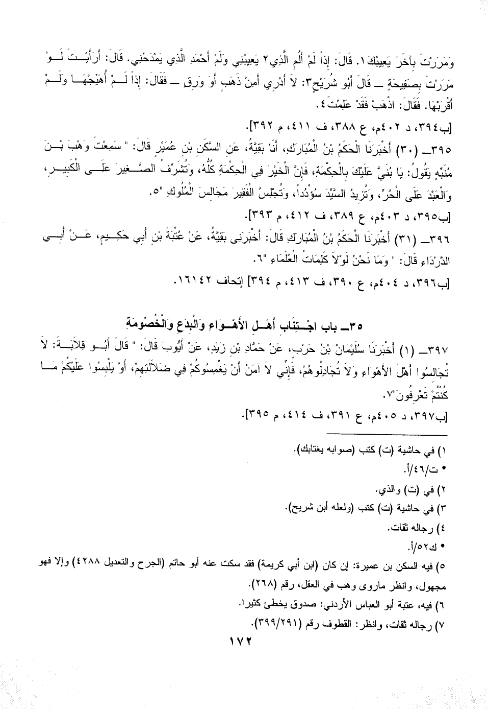 397 - (1) أَخْبَرَنَا سُلَيْمَانُ بْنُ حَرْبٍ، عَنْ حَمَّادِ بْنِ زَيْدٍ، عَنْ أَيُّوبَ قَالَ: " قَالَ أَبُو قِلاَبَةَ: لاَ تُجَالِسُوا أَهْلَ الأَهْوَاءِ وَلاَ تُجَادِلُوهُمْ، فَإِنِّي لاَ آمَنُ أَنْ يَغْمِسُوكُمْ فِي ضَلاَلَتِهِمْ، أَوْ يَلْبِسُوا عَلَيْكُمْ مَا كُنْتُمْ تَعْرِفُونَ" (¬7).