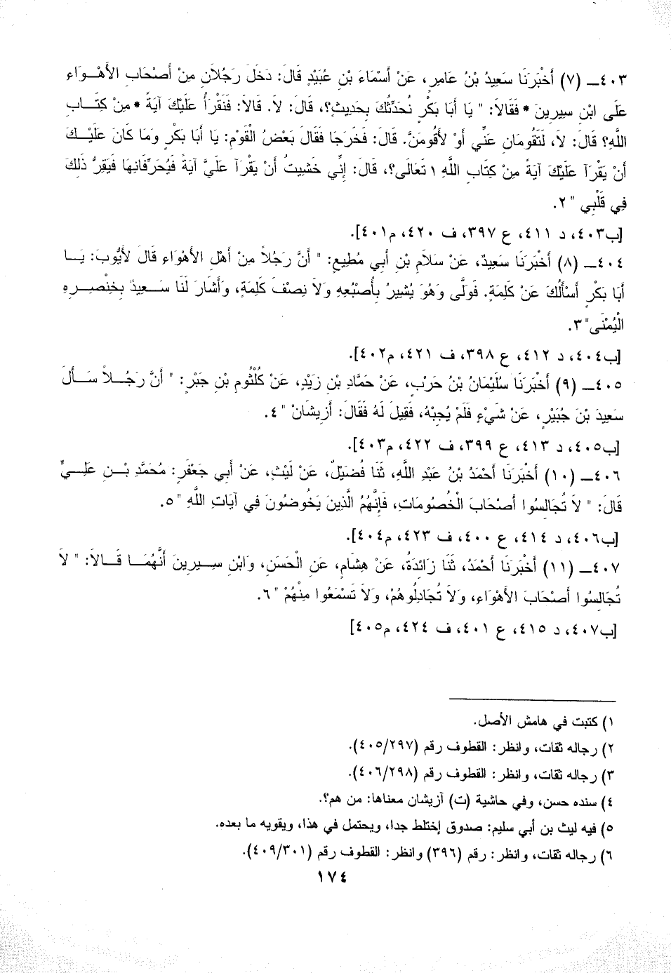 404 - (8) أَخْبَرَنَا سَعِيدٌ، عَنْ سَلاَمِ بْنِ أَبِي مُطِيعٍ: " أَنَّ رَجُلاً مِنْ أَهْلِ الأَهْوَاءِ قَالَ لأَيُّوبَ: يَا أَبَا بَكْرٍ أَسْأَلُكَ عَنْ كَلِمَةٍ. فَوَلَّى وَهُوَ يُشِيرُ بِأُصْبُعِهِ وَلاَ نِصْفَ كَلِمَةٍ، وَأَشَارَ لَنَا سَعِيدٌ بِخِنْصِرِهِ الْيُمْنَى" (¬3).