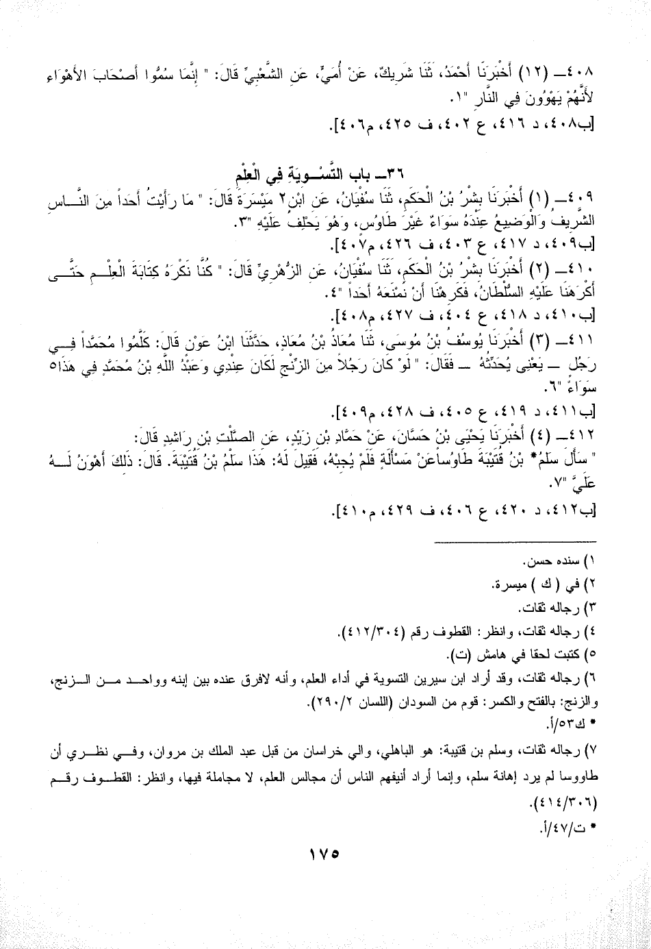 (¬7) رجاله ثقات، وسلم بن قتيبة: هو الباهلي، والي خراسان من قبل عبد الملك بن مروان، وفي نظري أن طاووسا لم يرد إهانة سلم، وإنما أراد أنيفهم الناس أن مجالس العلم، لا مجاملة فيها، وانظر: القطوف رقم (306/ 414).