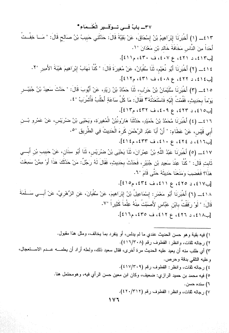 415 - (3) أَخْبَرَنَا سُلَيْمَانُ بْنُ حَرْبٍ، ثَنَا حَمَّادُ بْنُ زَيْدٍ، عَنْ أَيُّوبَ قَالَ: " حَدَّثَ سَعِيدُ بْنُ جُبَيْرٍ يَوْماً بِحَدِيثٍ، فَقُمْتُ إِلَيْهِ فَاسْتَعَدْتُهُ (¬3) فَقَالَ: مَا كُلَّ سَاعَةٍ أَحْلُبُ فَأُشْرَبُ " (¬4).