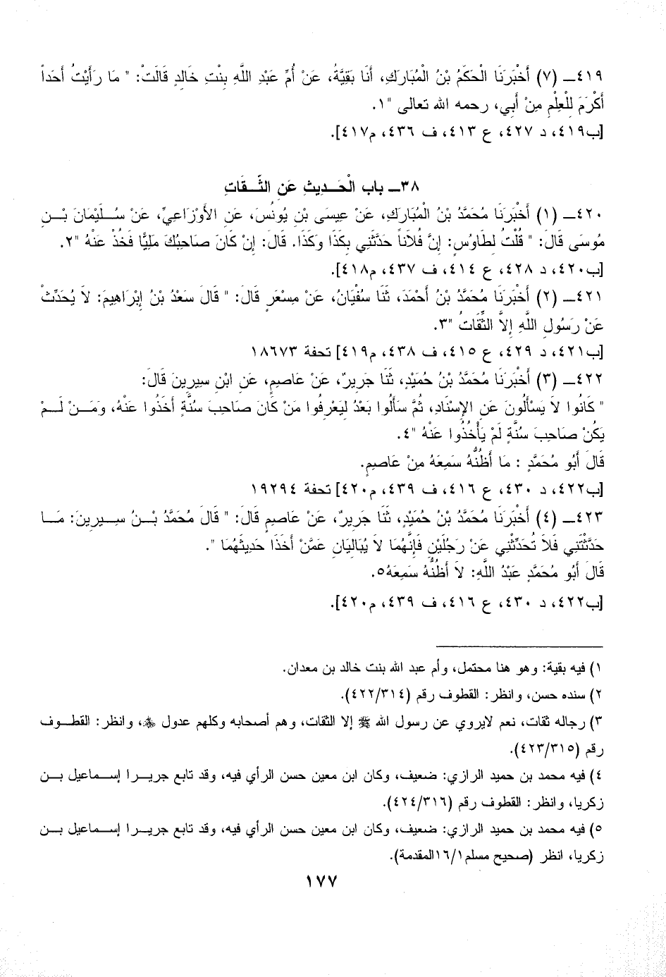 421 - (2) أَخْبَرَنَا مُحَمَّدُ بْنُ أَحْمَدَ، ثَنَا سُفْيَانُ، عَنْ مِسْعَرٍ قَالَ: " قَالَ سَعْدُ بْنُ إِبْرَاهِيمَ: لاَ يُحَدِّثْ عَنْ رَسُولِ اللَّهِ إِلاَّ الثِّقَاتُ " (¬3).