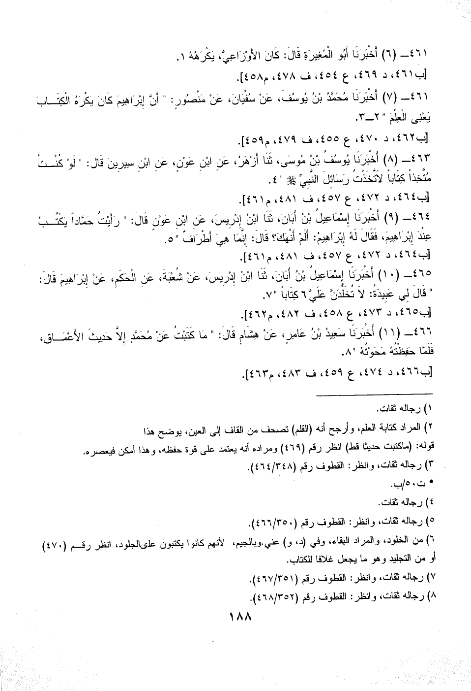 461 - (7) أَخْبَرَنَا مُحَمَّدُ بْنُ يُوسُفَ، عَنْ سُفْيَانَ، عَنْ مَنْصُورٍ: " أَنَّ إِبْرَاهِيمَ كَانَ يَكْرَهُ الْكِتَابَ يَعْنِى الْعِلْمَ " (¬2) - (¬3).