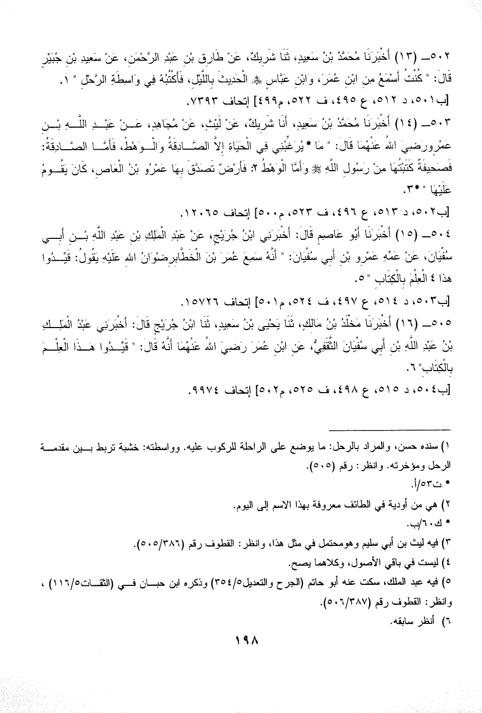 502 - (13) أَخْبَرَنَا مُحَمَّدُ بْنُ سَعِيدٍ، ثَنَا شَرِيكٌ، عَنْ طَارِقِ بْنِ عَبْدِ الرَّحْمَنِ، عَنْ سَعِيدِ بْنِ جُبَيْرٍ قَالَ: " كُنْتُ أَسْمَعُ مِنِ ابْنِ عُمَرَ، وَابْنِ عَبَّاسٍ - رضي الله عنهم - الْحَدِيثَ بِاللَّيْلِ، فَأَكْتُبُهُ فِي وَاسِطَةِ الرَّحْلِ " (¬1).