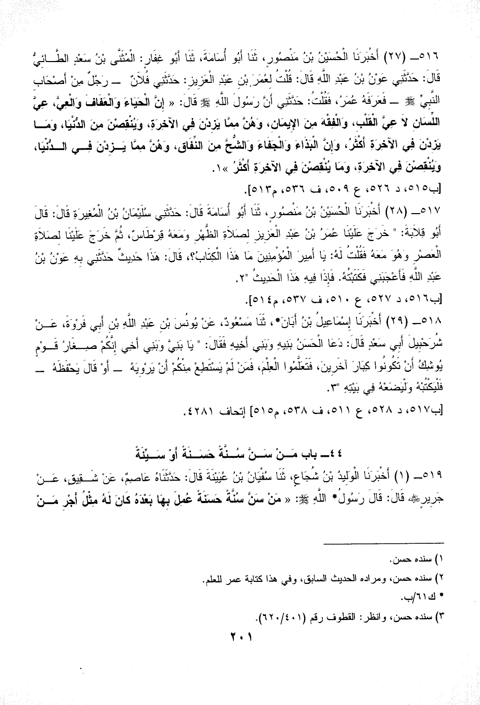 516 - (27) أَخْبَرَنَا الْحُسَيْنُ بْنُ مَنْصُورٍ، ثَنَا أَبُو أُسَامَةَ، ثَنَا أَبُو غِفَارٍ: الْمُثَنَّى بْنُ سَعْدٍ الطَّائِيُّ قَالَ: حَدَّثَنِي عَوْنُ بْنُ عَبْدِ اللَّهِ قَالَ: قُلْتُ لِعُمَرَ بْنِ عَبْدِ الْعَزِيزِ: حَدَّثَنِي فُلاَنٌ - رَجُلٌ مِنْ أَصْحَابِ النَّبِيِّ - صلى الله عليه وسلم - - فَعَرَفَهُ عُمَرُ، فَقُلْتُ: حَدَّثَنِي أَنَّ رَسُولَ اللَّهِ - صلى الله عليه وسلم - قَالَ: «إِنَّ الْحَيَاءَ وَالْعَفَافَ وَالْعِيَّ، عِيَّ اللِّسَانِ لاَ عِيَّ الْقَلْبِ، وَالْفِقْهَ مِنَ الإِيمَانِ، وَهُنَّ مِمَّا يَزِدْنَ فِي الآخِرَةِ، وَيُنْقِصْنَ مِنَ الدُّنْيَا، وَمَا يَزِدْنَ فِي الآخِرَةِ أَكْثَرُ، وَإِنَّ الْبَذَاءَ وَالْجَفَاءَ وَالشُّحَّ مِنَ النِّفَاقِ، وَهُنَّ مِمَّا يَزِدْنَ فِي الدُّنْيَا، وَيُنْقِصْنَ فِي الآخِرَةِ، وَمَا يُنْقِصْنَ فِي الآخِرَةِ أَكْثَرُ» (¬1).