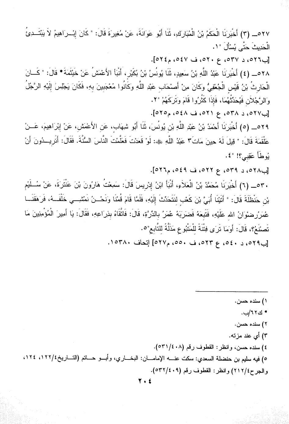 529 - (5) أَخْبَرَنَا أَحْمَدُ بْنُ عَبْدِ اللَّهِ بْنِ يُونُسَ، ثَنَا أَبُو شِهَابٍ، عَنِ الأَعْمَشِ، عَنْ إِبْرَاهِيمَ، عَنْ عَلْقَمَةَ قَالَ: " قِيلَ لَهُ حِينَ مَاتَ (¬3) عَبْدُ اللَّهِ - رضي الله عنه -: لَوْ قَعَدْتَ فَعَلَّمْتَ النَّاسَ السُّنَّةَ. فَقَالَ: أَتُرِيدُونَ أَنْ يُوطَأَ عَقِبِي؟ ! " (¬4).