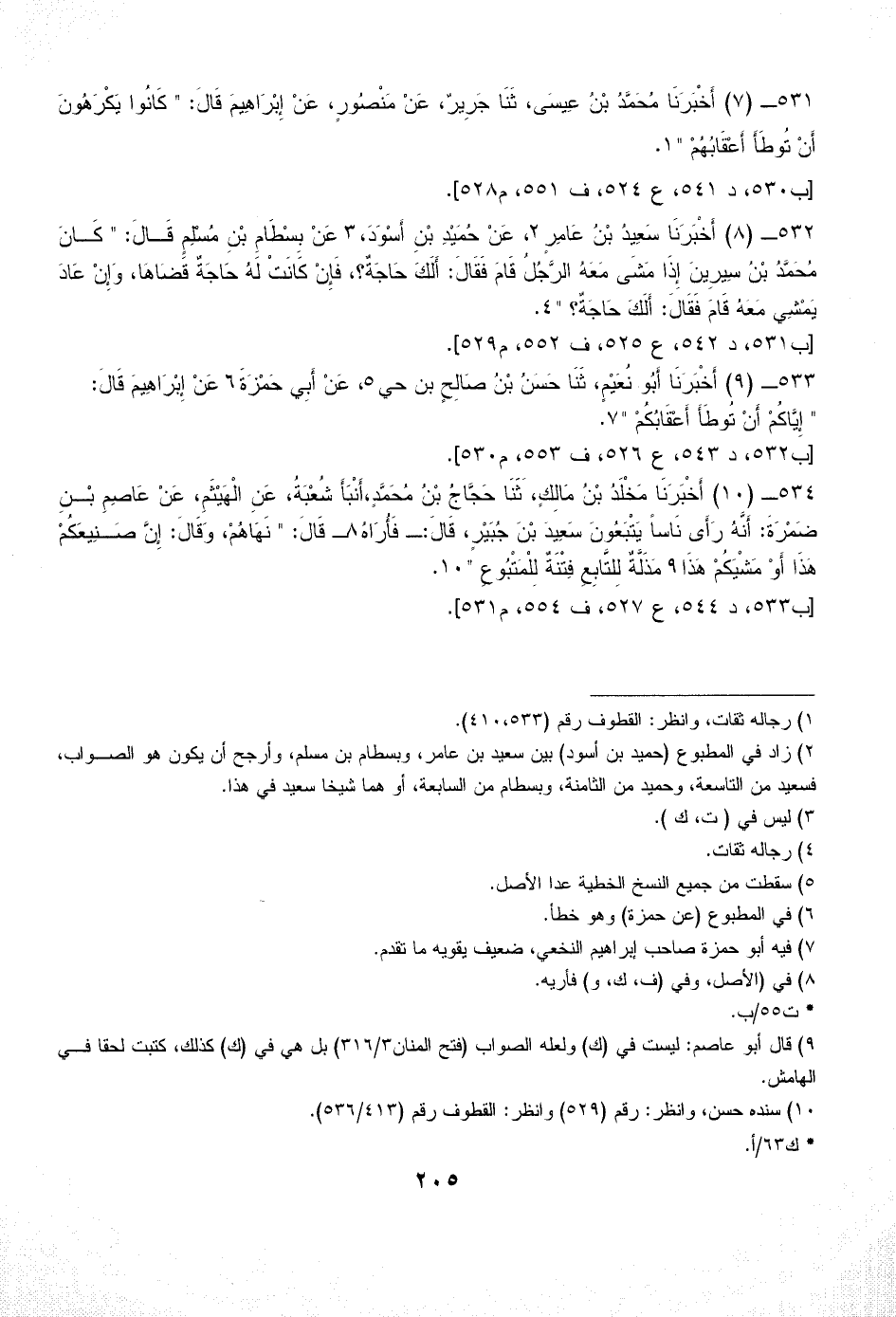 531 - (7) أَخْبَرَنَا مُحَمَّدُ بْنُ عِيسَى، ثَنَا جَرِيرٌ، عَنْ مَنْصُورٍ، عَنْ إِبْرَاهِيمَ قَالَ: " كَانُوا يَكْرَهُونَ أَنْ تُوطَأَ أَعْقَابُهُمْ " (¬1).