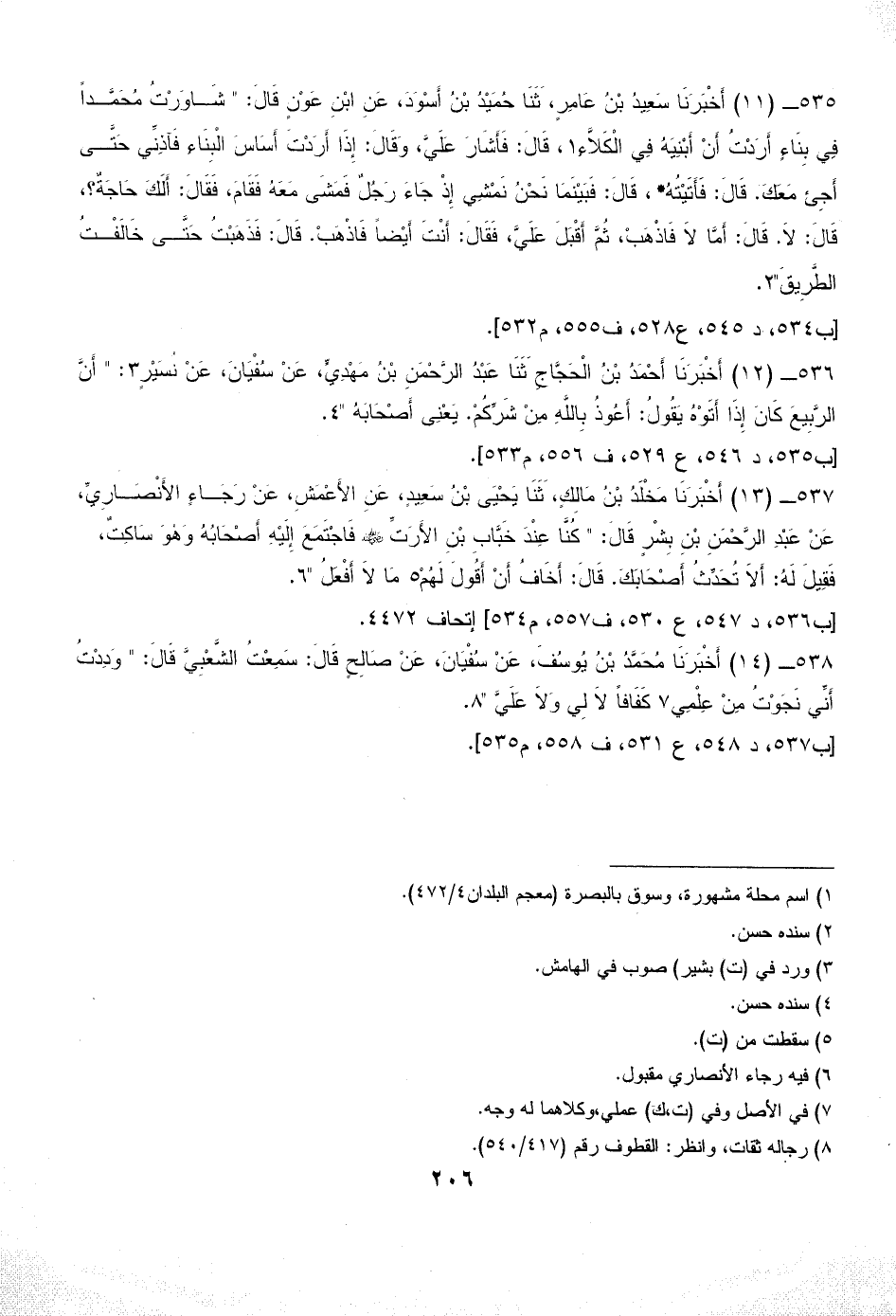 536 - (12) أَخْبَرَنَا أَحْمَدُ بْنُ الْحَجَّاجِ ثَنَا عَبْدُ الرَّحْمَنِ بْنُ مَهْدِيٍّ، عَنْ سُفْيَانَ، عَنْ نُسَيْرٍ (¬3): " أَنَّ الرَّبِيعَ كَانَ إِذَا أَتَوْهُ يَقُولُ: أَعُوذُ بِاللَّهِ مِنْ شَرِّكُمْ. يَعْنِى أَصْحَابَهُ " (¬4).