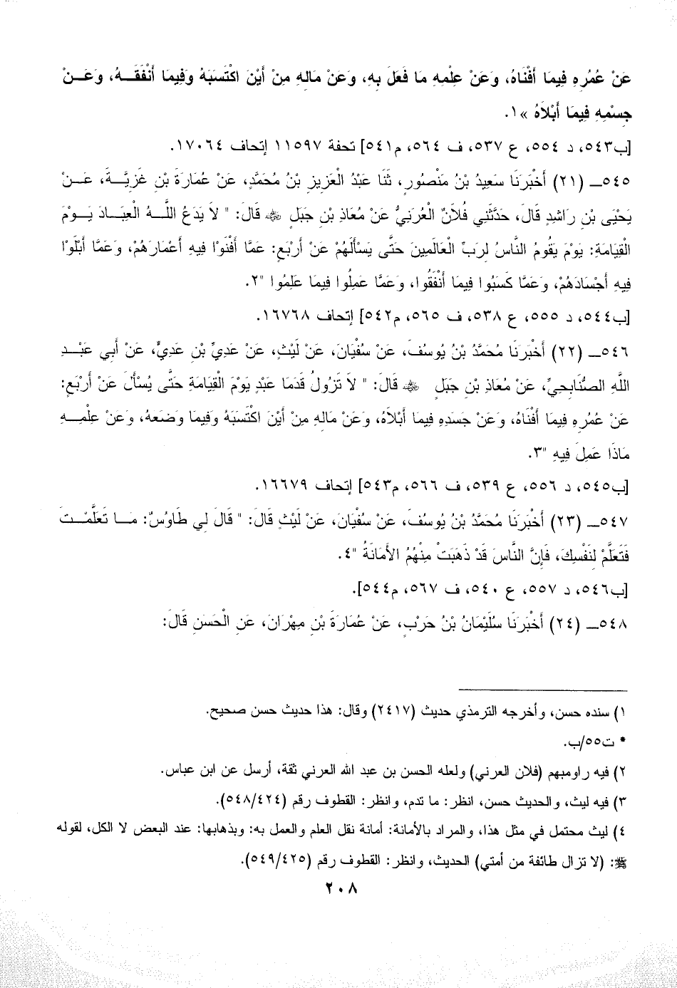 546 - (22) أَخْبَرَنَا مُحَمَّدُ بْنُ يُوسُفَ، عَنْ سُفْيَانَ، عَنْ لَيْثٍ، عَنْ عَدِيِّ بْنِ عَدِيٍّ، عَنْ أَبِي عَبْدِ اللَّهِ الصُّنَابِحِيِّ، عَنْ مُعَاذِ بْنِ جَبَلٍ - رضي الله عنه - قَالَ: " لاَ تَزُولُ قَدَمَا عَبْدٍ يَوْمَ الْقِيَامَةِ حَتَّى يُسْأَلَ عَنْ أَرْبَعٍ: عَنْ عُمُرِهِ فِيمَا أَفْنَاهُ، وَعَنْ جَسَدِهِ فِيمَا أَبْلاَهُ، وَعَنْ مَالِهِ مِنْ أَيْنَ اكْتَسَبَهُ وَفِيمَا وَضَعَهُ، وَعَنْ عِلْمِهِ مَاذَا عَمِلَ فِيهِ " (¬3).
