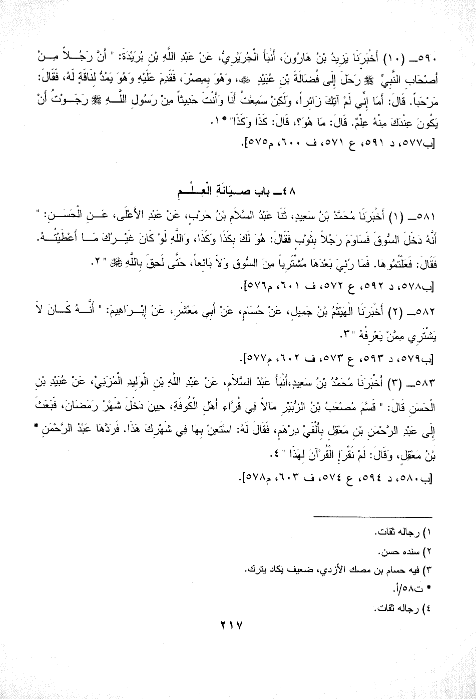 590 - (10) أَخْبَرَنَا يَزِيدُ بْنُ هَارُونَ، أَنْبَأَ الْجُرَيْرِيُّ، عَنْ عَبْدِ اللَّهِ بْنِ بُرَيْدَةَ: " أَنَّ رَجُلاً مِنْ أَصْحَابِ النَّبِيِّ - صلى الله عليه وسلم - رَحَلَ إِلَى فُضَالَةَ بْنِ عُبَيْدٍ - رضي الله عنه -، وَهُوَ بِمِصْرَ، فَقَدِمَ عَلَيْهِ وَهُوَ يَمُدُّ لِنَاقَةٍ لَهُ، فَقَالَ: مَرْحَباً. قَالَ: أَمَا إِنِّي لَمْ آتِكَ زَائِراً، وَلَكِنْ سَمِعْتُ أَنَا وَأَنْتَ حَدِيثاً مِنْ رَسُولِ اللَّهِ - صلى الله عليه وسلم - رَجَوْتُ أَنْ يَكُونَ عِنْدَكَ مِنْهُ عِلْمٌ. قَالَ: مَا هُوَ؟ ، قَالَ: كَذَا وَكَذَا"* (¬1).