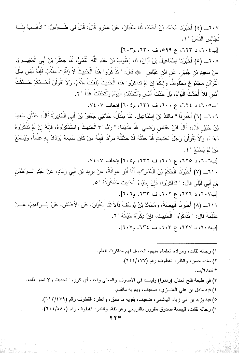 609 - (6) أَخْبَرَنَا* مَالِكُ بْنُ إِسْمَاعِيلَ، ثَنَا مِنْدَلُ، حَدَّثَنِي جَعْفَرُ بْنُ أَبِي الْمُغِيرَةَ قَالَ: حَدَّثَنِ سَعِيدُ بْنُ جُبَيْرٍ قَالَ: قَالَ ابْنُ عَبَّاسٍ رَضِي اللهُ عَنْهُمَا: " رُدُّوا (¬3) الْحَدِيثَ وَاسْتَذْكِرُوهُ، فَإِنَّهُ إِنْ لَمْ تَذْكُرُوهُ ذَهَبَ، وَلاَ يَقُولَنَّ رَجُلٌ لِحَدِيثٍ قَدْ حَدَّثَهُ قَدْ حَدَّثْتُهُ مَرَّةً، فَإِنَّهُ مَنْ كَانَ سَمِعَهُ يَزْدَادُ بِهِ عِلْماً، وَيَسْمَعُ مَنْ لَمْ يَسْمَعْ " (¬4).