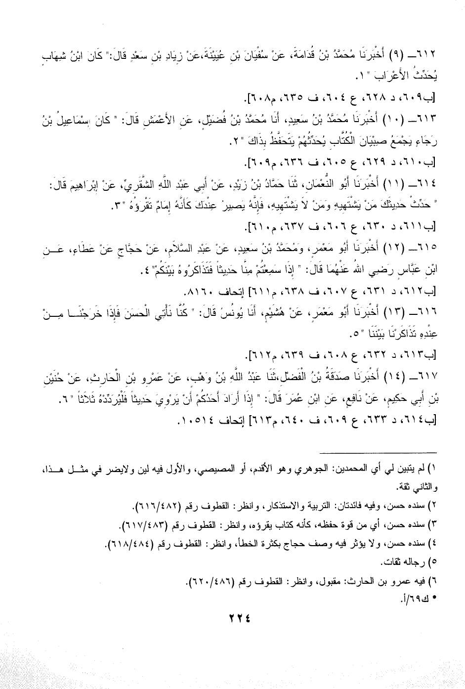 612 - (9) أَخْبَرَنَا مُحَمَّدُ بْنُ قُدَامَةَ، عَنْ سُفْيَانَ بْنِ عُيَيْنَةَ، عَنْ زِيَادِ بْنِ سَعْدٍ قَالَ: " كَانَ ابْنُ شِهَابٍ يُحَدِّثُ الأَعْرَابَ " (¬1).