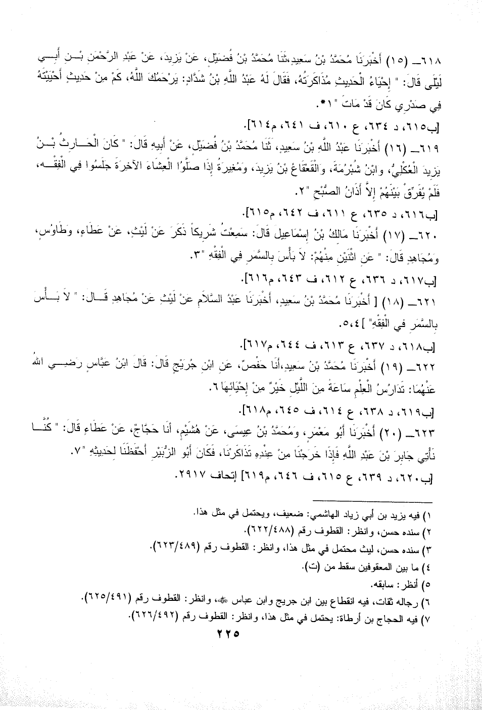 622 - (19) أَخْبَرَنَا مُحَمَّدُ بْنُ سَعِيدٍ، أَنَا حَفْصٌ، عَنِ ابْنِ جُرَيْجٍ قَالَ: قَالَ ابْنُ عَبَّاسٍ رَضِي اللهُ عَنْهُمَا: تَدَارُسُ الْعِلْمِ سَاعَةً مِنَ اللَّيْلِ خَيْرٌ مِنْ إِحْيَائِهَا (¬6).
