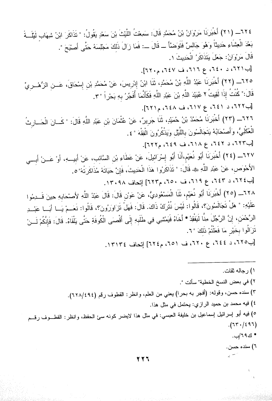 626 - (23) أَخْبَرَنَا مُحَمَّدُ بْنُ حُمَيْدٍ، ثَنَا جَرِيرٌ، عَنْ عُثْمَانَ بْنِ عَبْدِ اللَّهِ قَالَ: " كَانَ الْحَارِثُ الْعُكْلِيُّ، وَأَصْحَابُهُ يَتَجَالَسُونَ بِاللَّيْلِ وَيَذْكُرُونَ الْفِقْهَ " (¬4).