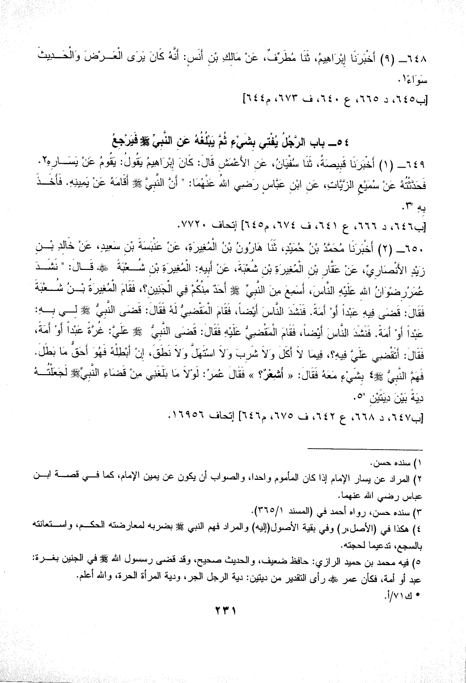 650 - (2) أَخْبَرَنَا مُحَمَّدُ بْنُ حُمَيْدٍ، ثَنَا هَارُونُ بْنُ الْمُغِيرَةِ، عَنْ عَنْبَسَةَ بْنِ سَعِيدٍ، عَنْ خَالِدِ بْنِ زَيْدٍ الأَنْصَارِيِّ، عَنْ عَقَّارِ بْنِ الْمُغِيرَةِ بْنِ شُعْبَةَ، عَنْ أَبِيهِ: الْمُغِيرَةِ بْنِ شُعْبَةَ - رضي الله عنه - قَالَ: " نَشَدَ عُمَرُ رِضْوَانُ اللهِ عَلَيْهِ النَّاسَ، أَسَمِعَ مِنَ النَّبِيِّ - صلى الله عليه وسلم - أَحَدٌ مِنْكُمْ فِي الْجَنِينِ؟ ، فَقَامَ الْمُغِيرَةُ بْنُ شُعْبَةَ فَقَالَ: قَضَى فِيهِ عَبْداً أَوْ أَمَةً. فَنَشَدَ النَّاسَ أَيْضاً، فَقَامَ الْمَقْضِيُّ لَهُ فَقَالَ: قَضَى النَّبِيُّ - صلى الله عليه وسلم - لِي بِهِ: عَبْداً أَوْ أَمَةً. فَنَشَدَ النَّاسَ أَيْضاً، فَقَامَ الْمَقْضِيُّ عَلَيْهِ فَقَالَ: قَضَى النَّبِيُّ - صلى الله عليه وسلم - عَلَيَّ: غُرَّةً عَبْداً أَوْ أَمَةً، فَقَالَ: أَتَقْضِي عَلَيَّ فِيهِ؟ ، فِيمَا لاَ أَكَلَ وَلاَ شَرِبَ وَلاَ اسْتَهَلَّ وَلاَ نَطَقَ، إِنْ أَبْطِلْهُ فَهُوَ أَحَقُّ مَا بَطَلَ. فَهَمَّ النَّبِيُّ - صلى الله عليه وسلم - (¬4) بِشَيْءٍ مَعَهُ فَقَالَ: «أَشِعْرٌ؟ » فَقَالَ عُمَرُ: لَوْلاَ مَا بَلَغَنِي مِنْ قَضَاءِ النَّبِيِّ - صلى الله عليه وسلم - لَجَعَلْتُهُ دِيَةً بَيْنَ دِيَتَيْنِ " (¬5).
