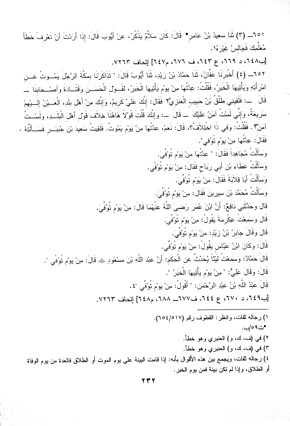 652 - (4) أَخْبَرَنَا عَفَّانُ، ثَنَا حَمَّادُ بْنُ زَيْدٍ، ثَنَا أَيُّوبُ قَالَ: " تَذَاكَرْنَا بِمَكَّةَ الرَّجُلَ يَمُوتُ عَنِ امْرَأَتِهِ وَيَأْتِيهَا الْخَبَرُ، فَقُلْتُ: عِدَّتُهَا مِنْ يَوْمِ يَأْتِيهَا الْخَبَرُ، لِقَوْلِ الْحَسَنِ وَقَتَادَةَ وَأَصْحَابِنَا - ... قَالَ ـ: فَلَقِيَنِي طَلْقُ بْنُ حَبِيبٍ الْعَنَزِيُّ (¬2) فَقَالَ: إِنَّكَ عَلَيَّ كَرِيمٌ، وَإِنَّكَ مِنْ أَهْلِ بَلَدٍ، الْعَيْنُ إِلَيْهِمْ سَرِيعَةٌ، وَإِنِّي لَسْتُ آمَنُ عَلَيْكَ - قَالَ ـ: وَإِنَّكَ قُلْتَ قَوْلاً هَاهُنَا خِلاَفَ قَوْلِ أَهْلِ الْبَلَدِ، وَلَسْتُ آمَنُ (¬3). فَقُلْتُ: وَفِي ذَا اخْتِلاَفٌ؟ ، قَالَ: نَعَمْ، عِدَّتُهَا مِنْ يَوْمِ يَمُوتُ. فَلَقِيتُ سَعِيدَ بْنَ جُبَيْرٍ فَسَأَلْتُهُ فَقَالَ: عِدَّتُهَا مِنْ يَوْمِ تُوُفي".