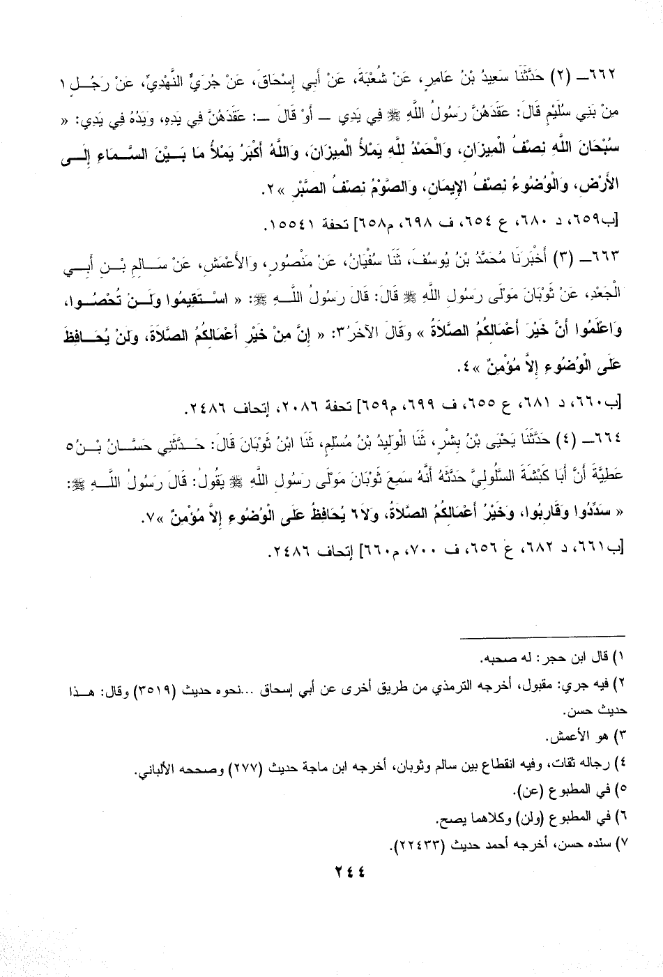 663 - (3) أَخْبَرَنَا مُحَمَّدُ بْنُ يُوسُفَ، ثَنَا سُفْيَانُ، عَنْ مَنْصُورٍ، وَالأَعْمَشِ، عَنْ سَالِمِ بْنِ أَبِي الْجَعْدِ، عَنْ ثَوْبَانَ مَوْلَى رَسُولِ اللَّهِ - صلى الله عليه وسلم - قَالَ: قَالَ رَسُولُ اللَّهِ - صلى الله عليه وسلم -: «اسْتَقِيمُوا وَلَنْ تُحْصُوا، وَاعْلَمُوا أَنَّ خَيْرَ أَعْمَالِكُمُ الصَّلاَةُ» وَقَالَ الآخَرُ (¬3): «إِنَّ مِنْ خَيْرِ أَعْمَالِكُمُ الصَّلاَةَ، وَلَنْ يُحَافِظَ عَلَى الْوُضُوءِ إِلاَّ مُؤْمِنٌ» (¬4).