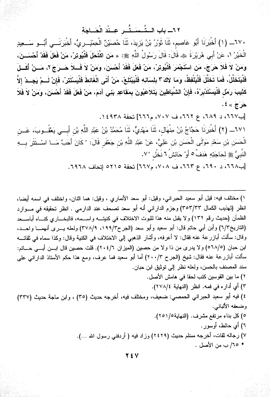 670 - (1) أَخْبَرَنَا أَبُو عَاصِمٍ، ثَنَا ثَوْرُ بْنُ يَزِيدَ، ثَنَا حُصَيْنٌ الْحِمْيَرِيُّ، أَخْبَرَنَي أَبُو سَعِيدٍ الْخَيْرُ (¬1)، عَنْ أَبِي هُرَيْرَةَ - رضي الله عنه - قَالَ: قَالَ رَسُولُ اللَّهِ - صلى الله عليه وسلم -: «مَنِ اكْتَحَلَ فَلْيُوتِرْ، مَنْ فَعَلَ فَقَدْ أَحْسَنَ، وَمَنْ لاَ فَلاَ حَرَجَ، مَنِ اسْتَجْمَرَ فَلْيُوتِرْ، مَنْ فَعَلَ فَقَدْ أَحْسَنَ، وَمَنْ لاَ فَلاَ حَرَجَ (¬2)، مَنْ أَكَلَ فَلْيَتَخَلَّلْ، فَمَا تَخَلَّلَ فَلْيَلْفِظْ، وَمَا لاَكَ (¬3) بِلِسَانِهِ فَلْيَبْتَلِعْ، مَنْ أَتَى الْغَائِطَ فَلْيَسْتَتِرْ، فَإِنْ لَمْ يَجِدْ إِلاَّ كَثِيبَ رَمْلٍ فَلْيَسْتَدْبِرْهُ، فَإِنَّ الشَّيَاطِينَ يَتَلاَعَبُونَ بِمَقَاعِدِ بَنِي آدَمَ، مَنْ فَعَلَ فَقَدْ أَحْسَنَ، وَمَنْ لاَ فَلاَ حَرَجَ» (¬4).