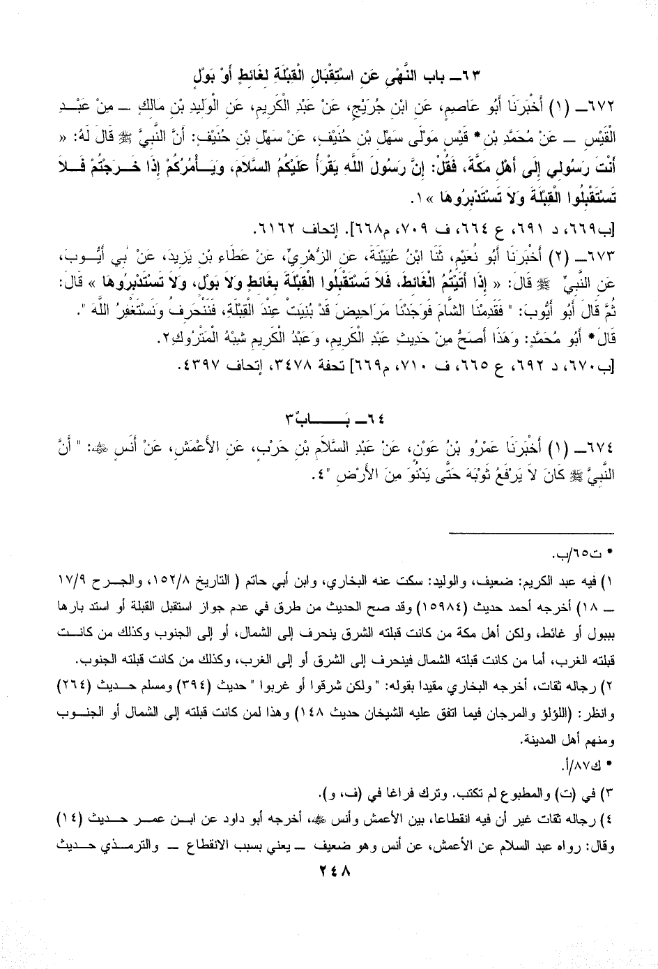 (¬2) رجاله ثقات، أخرجه البخاري مقيدا بقوله: " ولكن شرقوا أو غربوا " حديث (394) ومسلم حديث (264) وانظر: (اللؤلؤ والمرجان فيما اتفق عليه الشيخان حديث 148) وهذا لمن كانت قبلته إلى الشمال أو الجنوب ومنهم أهل المدينة.