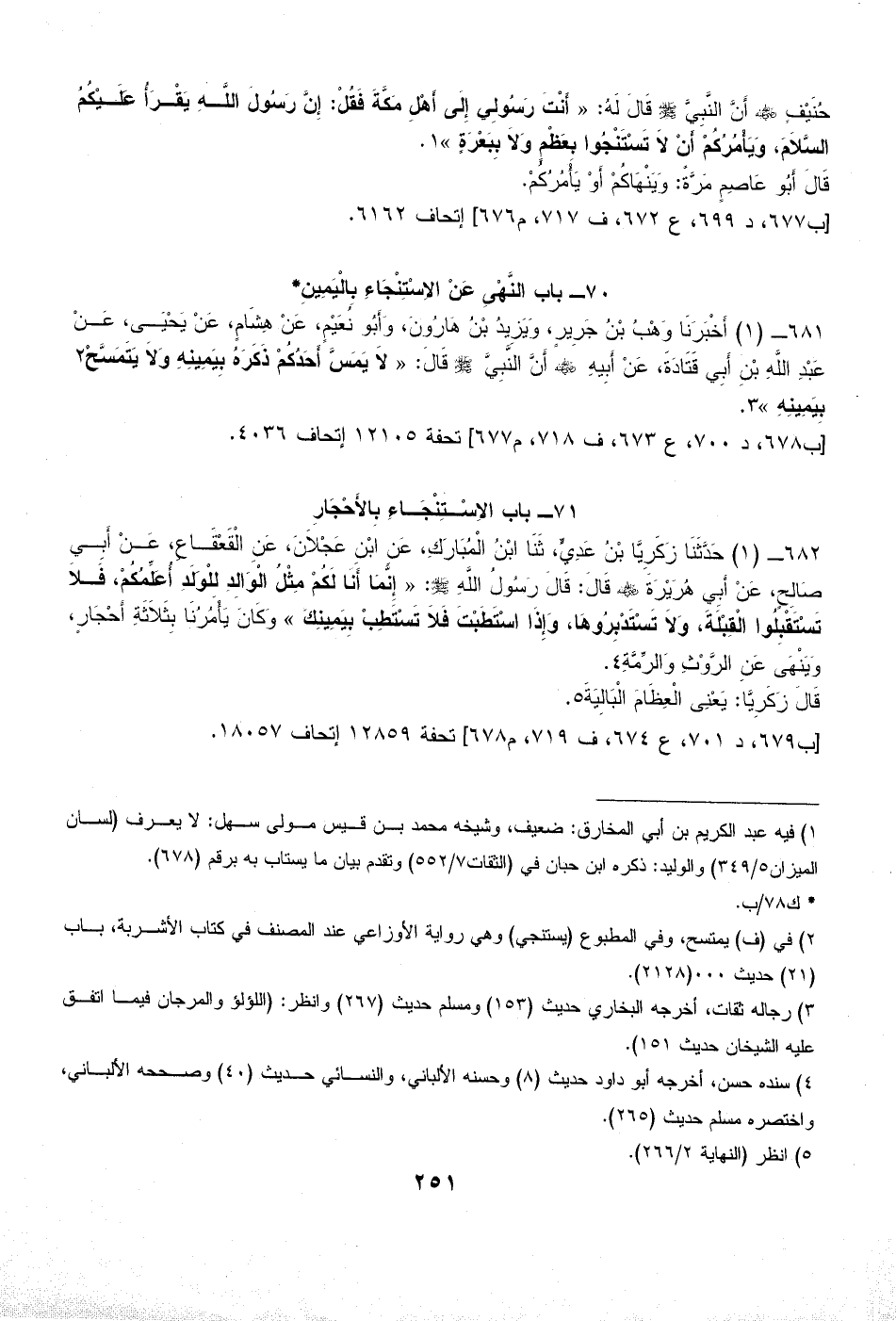 681 - (1) أَخْبَرَنَا وَهْبُ بْنُ جَرِيرٍ، وَيَزِيدُ بْنُ هَارُونَ، وَأَبُو نُعَيْمٍ، عَنْ هِشَامٍ، عَنْ يَحْيَى، عَنْ عَبْدِ اللَّهِ بْنِ أَبِي قَتَادَةَ، عَنْ أَبِيهِ - رضي الله عنه - أَنَّ النَّبِيَّ - صلى الله عليه وسلم - قَالَ: «لاَ يَمَسَّ أَحَدُكُمْ ذَكَرَهُ بِيَمِينِهِ وَلاَ يَتَمَسَّحْ (¬2) بِيَمِينِهِ» (¬3).