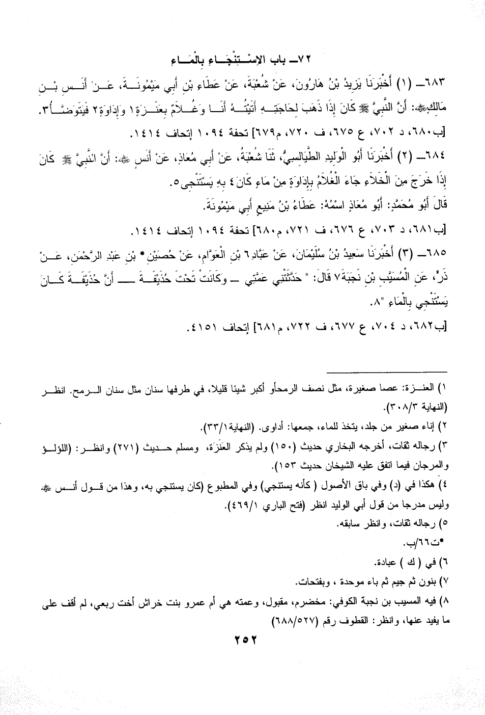 685 - (3) أَخْبَرَنَا سَعِيدُ بْنُ سُلَيْمَانَ، عَنْ عَبَّادِ (¬6) بْنِ الْعَوَّامِ، عَنْ حُصَيْنِ* بْنِ عَبْدِ الرَّحْمَنِ، عَنْ ذَرٍّ، عَنِ الْمُسَيَّبِ بْنِ نَجَبَةَ (¬7) قَالَ: " حَدَّثَتْنِي عَمَّتِي - وَكَانَتْ تَحْتَ حُذَيْفَةَ - أَنَّ حُذَيْفَةَ كَانَ يَسْتَنْجِي بِالْمَاءِ " (¬8).