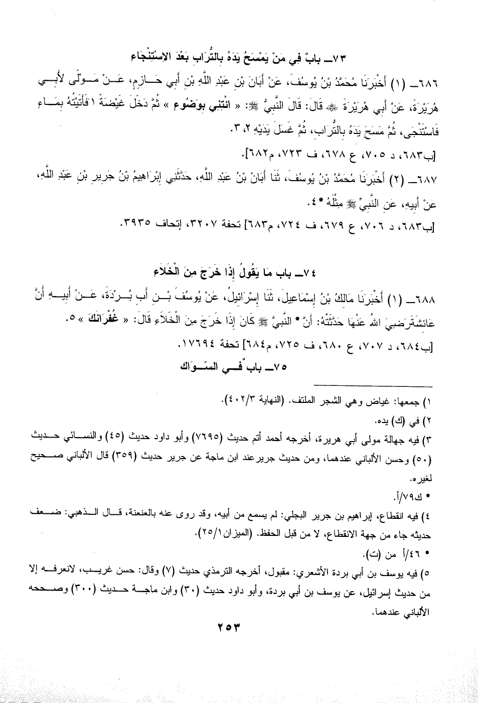 73 - بابٌ فِيمَنْ يَمْسَحُ يَدَهُ بِالتُّرَابِ بَعْدَ الاِسْتِنْجَاءِ