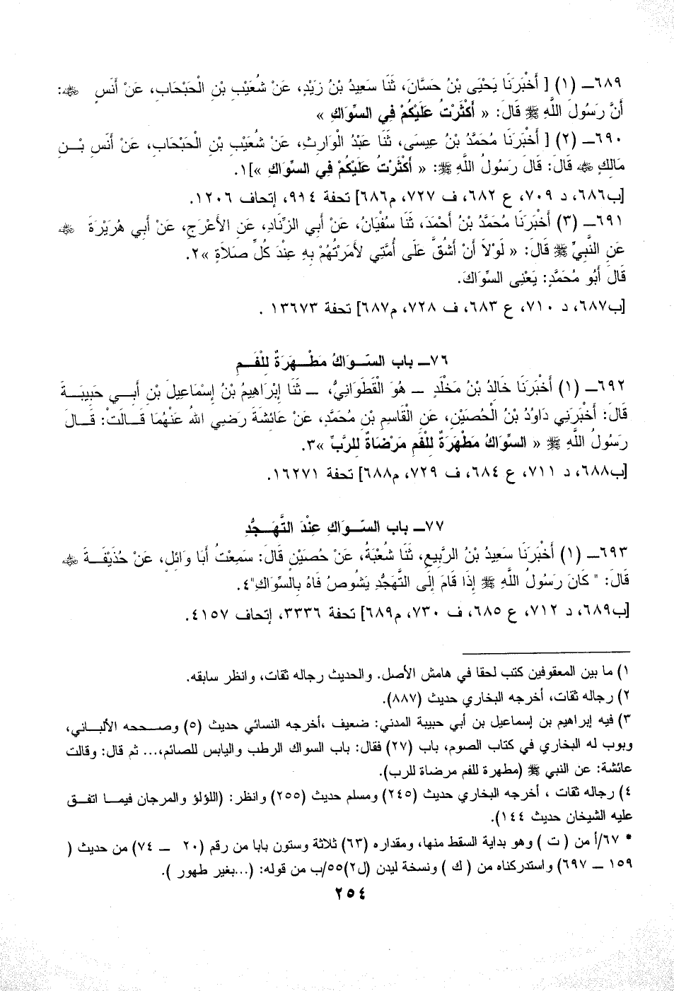 693 - (1) أَخْبَرَنَا سَعِيدُ بْنُ الرَّبِيعِ، ثَنَا شُعْبَةُ، عَنْ حُصَيْنٍ قَالَ: سَمِعْتُ أَبَا وَائِلٍ، عَنْ حُذَيْفَةَ - رضي الله عنه - قَالَ: " كَانَ رَسُولُ اللَّهِ - صلى الله عليه وسلم - إِذَا قَامَ إِلَى التَّهَجُّدِ يَشُوصُ فَاهُ بِالسِّوَاكِ" (¬4).