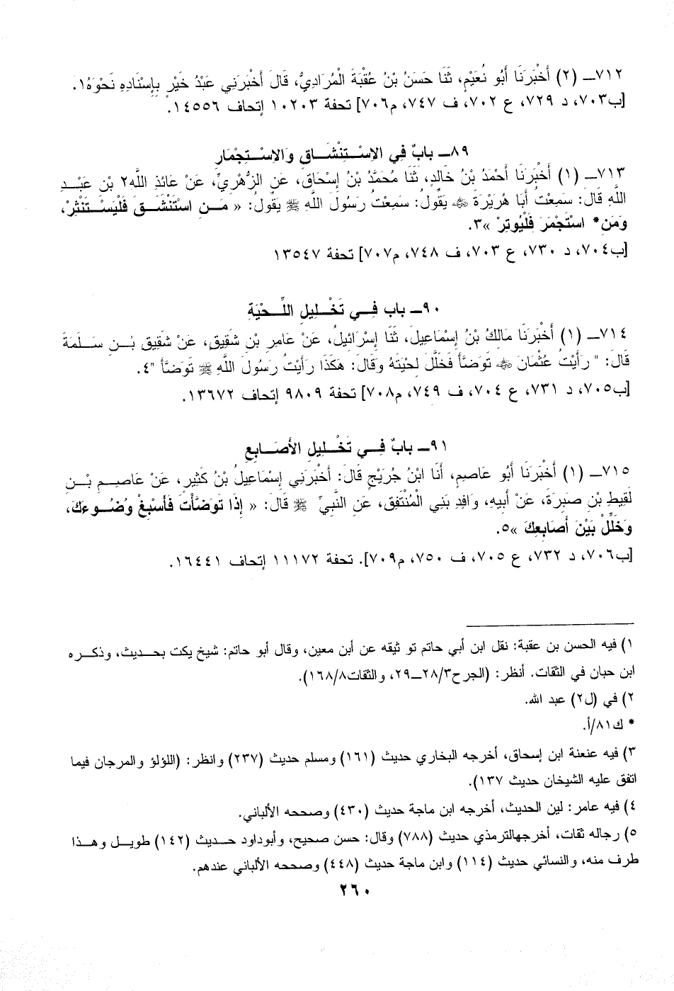 715 - (1) أَخْبَرَنَا أَبُو عَاصِمٍ، أَنَا ابْنُ جُرَيْجٍ قَالَ: أَخْبَرَنِي إِسْمَاعِيلُ بْنُ كَثِيرٍ، عَنْ عَاصِمِ بْنِ لَقِيطِ بْنِ صَبِرَةَ، عَنْ أَبِيهِ، وَافِدِ بَنِي الْمُنْتَفِقِ، عَنِ النَّبِيِّ - صلى الله عليه وسلم - قَالَ: «إِذَا تَوَضَّأْتَ فَأَسْبِغْ وُضُوءَكَ، وَخَلِّلْ بَيْنَ أَصَابِعِكَ» (¬5).