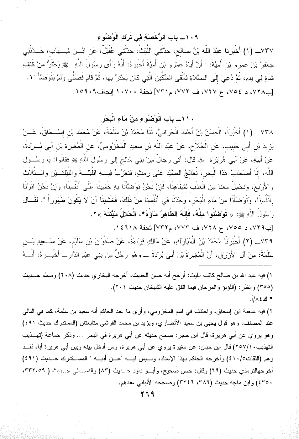 738 - (1) أَخْبَرَنَا الْحَسَنُ بْنُ أَحْمَدَ الْحَرَّانِيُّ، ثَنَا مُحَمَّدُ بْنُ سَلَمَةَ، عَنْ مُحَمَّدِ بْنِ إِسْحَاقَ، عَنْ يَزِيدَ بْنِ أَبِي حَبِيبٍ، عَنِ الْجُلاَحِ، عَنْ عَبْدِ اللَّهِ بْنِ سَعِيدٍ الْمَخْزُومِيِّ، عَنِ الْمُغِيرَةِ بْنِ أَبِي بُرْدَةَ، عَنْ أَبِيهِ، عَنْ أَبِي هُرَيْرَةَ - رضي الله عنه - قَالَ: أَتَى رِجَالٌ مِنْ بَنِي مُدْلِجٍ إِلَى رَسُولِ اللَّهِ - صلى الله عليه وسلم - فَقَالُوا: يَا رَسُولَ اللَّهِ، إِنَّا أَصْحَابُ هَذَا الْبَحْرِ، نُعَالِجُ الصَّيْدَ عَلَى رَمَثٍ، فَنَعْزُبُ فِيهِ اللَّيْلَةَ وَاللَّيْلَتَيْنِ وَالثَّلاَثَ وَالأَرْبَعَ، وَنَحْمِلُ مَعَنَا مِنَ الْعَذْبِ لِشِفَاهِنَا، فَإِنْ نَحْنُ تَوَضَّأْنَا بِهِ خَشِينَا عَلَى أَنْفُسِنَا، وَإِنْ نَحْنُ آثَرْنَا بِأَنْفُسِنَا، وَتَوَضَّأْنَا مِنْ مَاءِ الْبَحْرِ، وَجَدْنَا فِي أَنْفُسِنَا مِنْ ذَلِكَ، فَخَشِينَا أَنْ لاَ يَكُونَ طَهُوراً ". فَقَالَ رَسُولُ اللَّهِ - صلى الله عليه وسلم -: «تَوَضَّئُوا مِنْهُ، فَإِنَّهُ الطَّاهِرُ مَاؤُهُ*، الْحَلاَلُ مَيْتَتُهُ» (¬2).