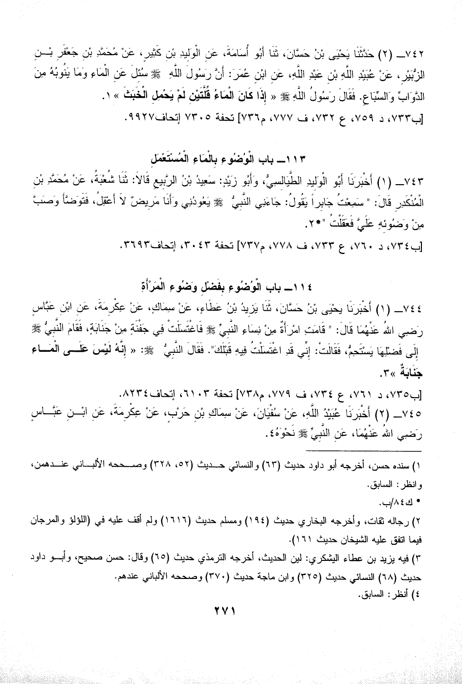 744 - (1) أَخْبَرَنَا يَحْيَى بْنُ حَسَّانَ، ثَنَا يَزِيدُ بْنُ عَطَاءٍ، عَنْ سِمَاكٍ، عَنْ عِكْرِمَةَ، عَنِ ابْنِ عَبَّاسٍ رَضِي اللهُ عَنْهُمَا قَالَ: " قَامَتِ امْرَأَةٌ مِنْ نِسَاءِ النَّبِيِّ - صلى الله عليه وسلم - فَاغْتَسَلَتْ فِي جَفْنَةٍ مِنْ جَنَابَةٍ، فَقَامَ النَّبِيُّ - صلى الله عليه وسلم - إِلَى فَضْلِهَا يَسْتَحِمُّ، فَقَالَتْ: إِنِّي قَدِ اغْتَسَلْتُ فِيهِ قَبْلَكَ". فَقَالَ النَّبِيُّ - صلى الله عليه وسلم -: «إِنَّهُ لَيْسَ عَلَى الْمَاءِ جَنَابَةٌ» (¬3).