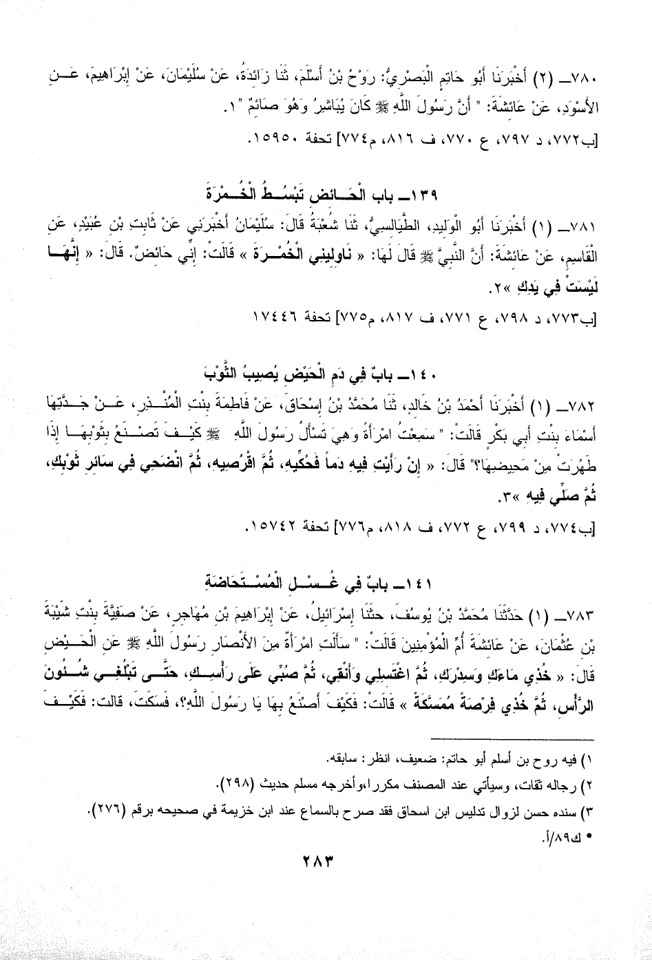 783 - (1) حَدَّثَنَا مُحَمَّدُ بْنُ يُوسُفَ، حثَنَا إِسْرَائِيلُ، عَنْ إِبْرَاهِيمَ بْنِ مُهَاجِرٍ، عَنْ صَفِيَّةَ بِنْتِ شَيْبَةَ بْنِ عُثْمَانَ، عَنْ عَائِشَةَ أُمِّ الْمُؤْمِنِينَ قَالَتْ: " سَأَلَتِ امْرَأَةٌ مِنَ الأَنْصَارِ رَسُولَ اللَّهِ - صلى الله عليه وسلم - عَنِ الْحَيْضِ قَالَ: «خُذِي مَاءَكِ وَسِدْرَكِ، ثُمَّ اغْتَسِلِي وَأَنْقِي، ثُمَّ صُبِّي عَلَى رَأْسِكِ، حَتَّى تَبْلُغِي شُئُونَ الرَّأْسِ، ثُمَّ خُذِي فِرْصَةً مُمَسَّكَةً» قَالَتْ: فَكَيْفَ أَصْنَعُ بِهَا يَا رَسُولَ اللَّهِ؟ ، فَسَكَتَ، قالت: فَكَيْفَ