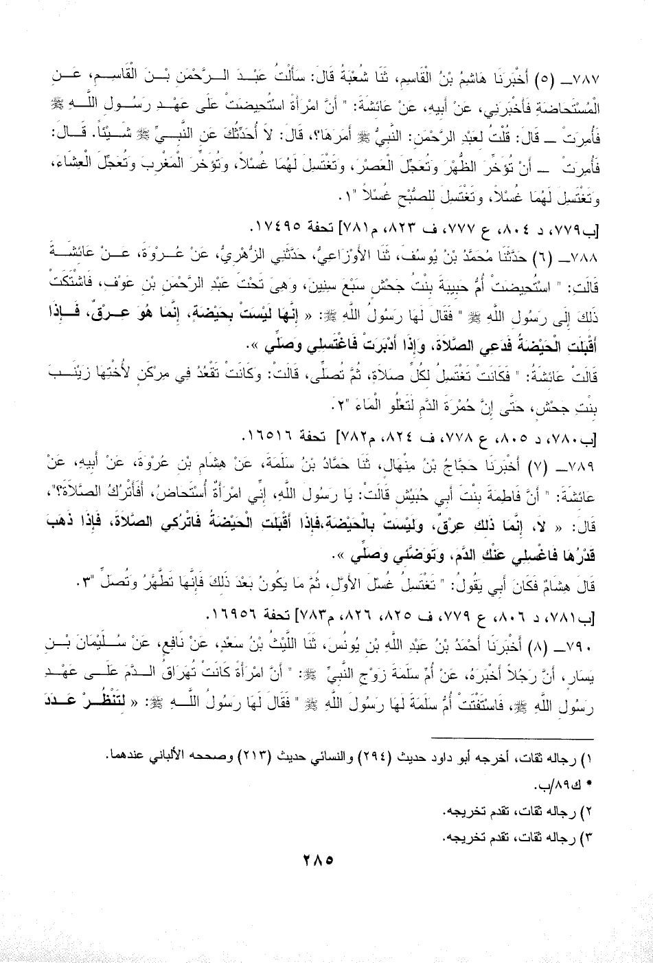 789 - (7) أَخْبَرَنَا حَجَّاجُ بْنُ مِنْهَالٍ، ثَنَا حَمَّادُ بْنُ سَلَمَةَ، عَنْ هِشَامِ بْنِ عُرْوَةَ، عَنْ أَبِيهِ، عَنْ عَائِشَةَ: " أَنَّ فَاطِمَةَ بِنْتَ أَبِي حُبَيْشٍ قَالَتْ: يَا رَسُولَ اللَّهِ، إِنِّي امْرَأَةٌ أُسْتَحَاضُ، أَفَأَتْرُكُ الصَّلاَةَ؟ "، قَالَ: «لاَ، إِنَّمَا ذَلِكِ عِرْقٌ، وَلَيْسَتْ بِالْحَيْضَةِ، فَإِذَا أَقْبَلَتِ الْحَيْضَةُ فَاتْرُكِي الصَّلاَةَ، فَإِذَا ذَهَبَ قَدْرُهَا فَاغْسِلِي عَنْكِ الدَّمَ، وَتَوَضَّئِي وَصَلِّي».